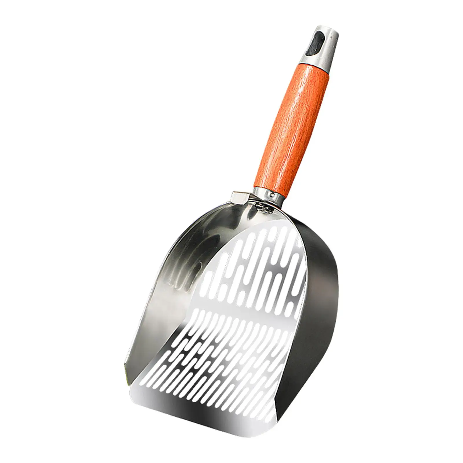 Material de primera calidad: fabricada con acero inoxidable 304 de calidad, esta pala para arena para gatos está diseñada para resistir el óxido y proporcionar durabilidad a largo plazo.El mango de madera ofrece un toque refinado y garantiza un agarre cómodo durante su uso.
