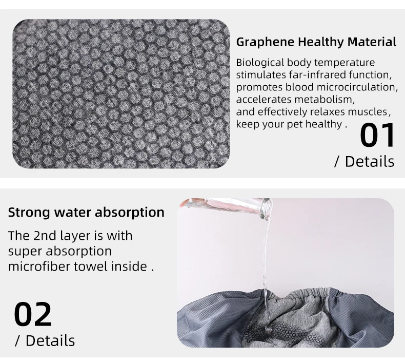 4.Material saludable de grafeno: la temperatura corporal biológica estimula la función de infrarrojo lejano, promueve la microcirculación sanguínea, acelera el metabolismo y relaja eficazmente los músculos y mantiene a su mascota saludable.