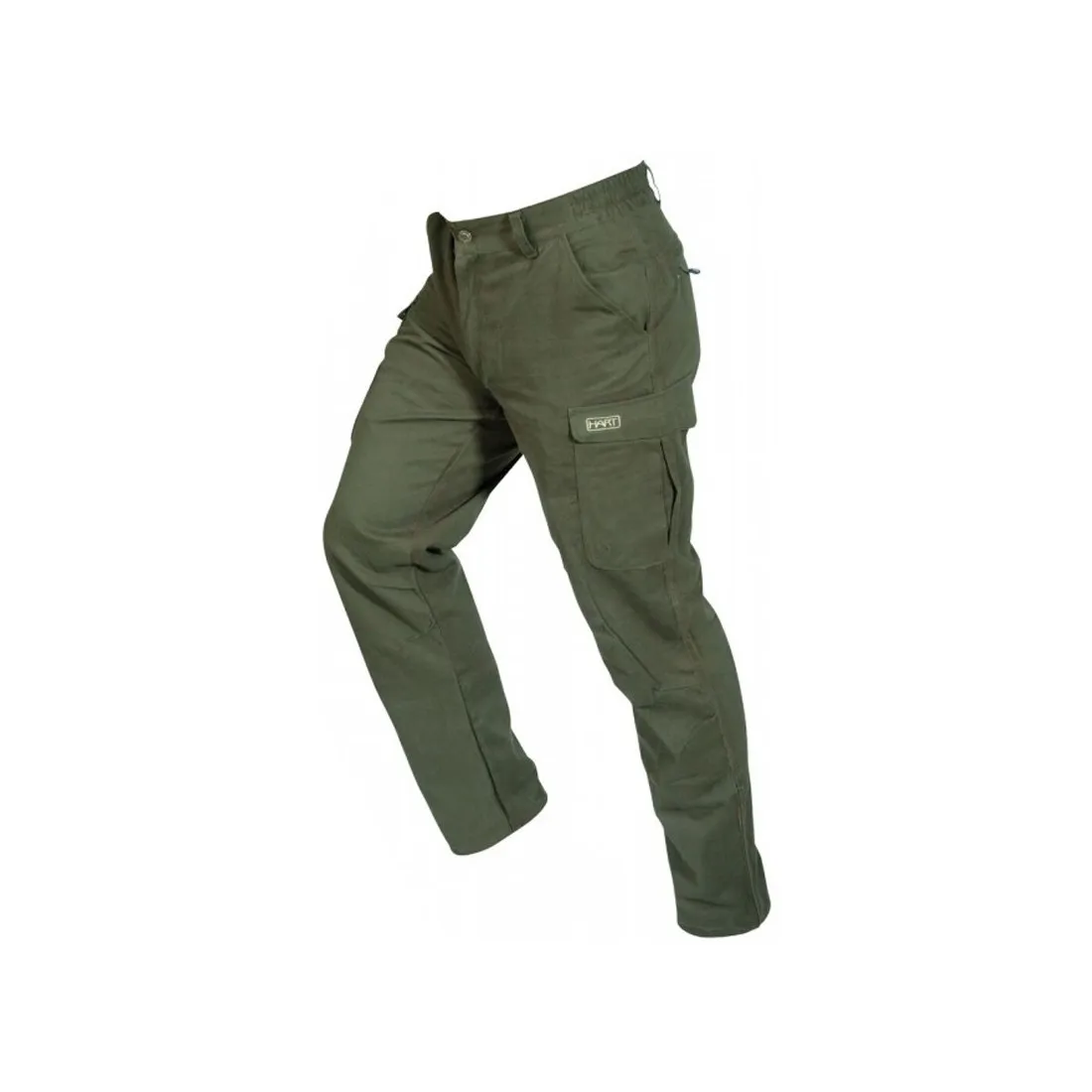 Pantalón básico de caza en twill de algodón. Exterior silencioso y repelente al agua. Cómodo para condiciones de caza en clima seco. Composición de 6 bolsillos: 2 frontales, 2 bolsillos cargo laterales y 2 bolsillos traseros con cremallera. Color verde 100% algodón