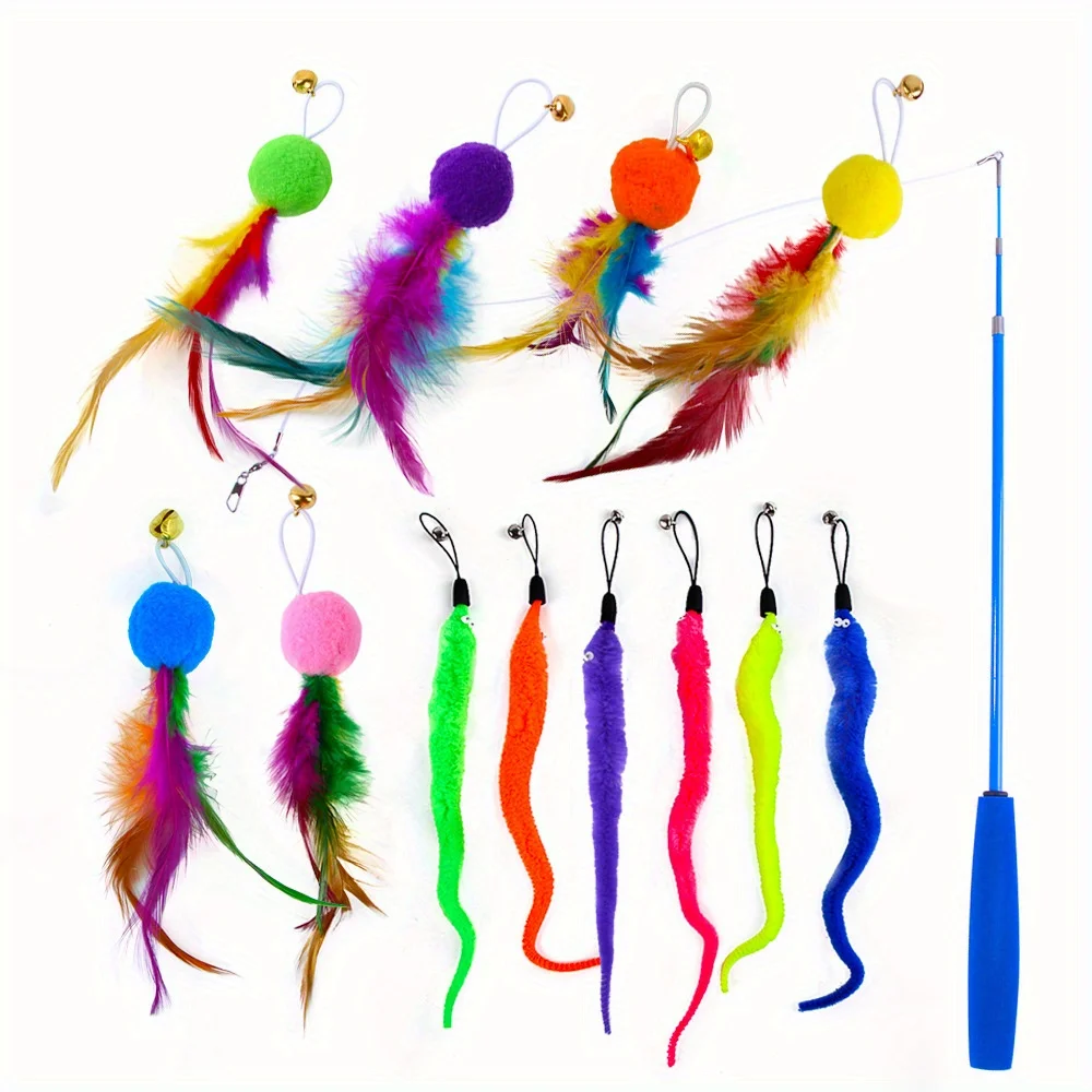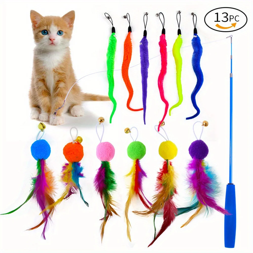 Paquete de 13 juguetes interactivos de plumas para gatos, varita retráctil para gatos, juguetes y rompecabezas de repuesto con recambios de campana para ejercicio de gatos