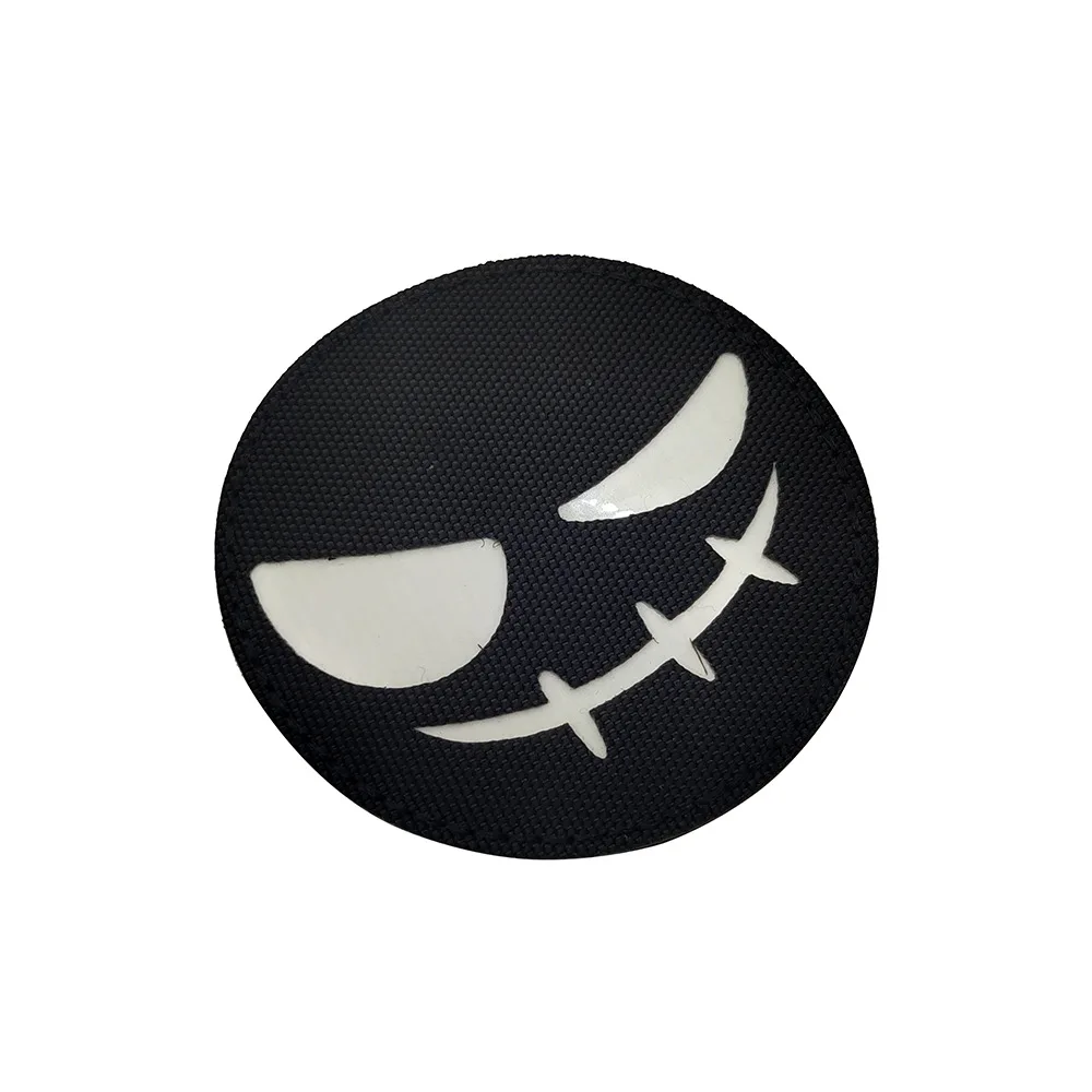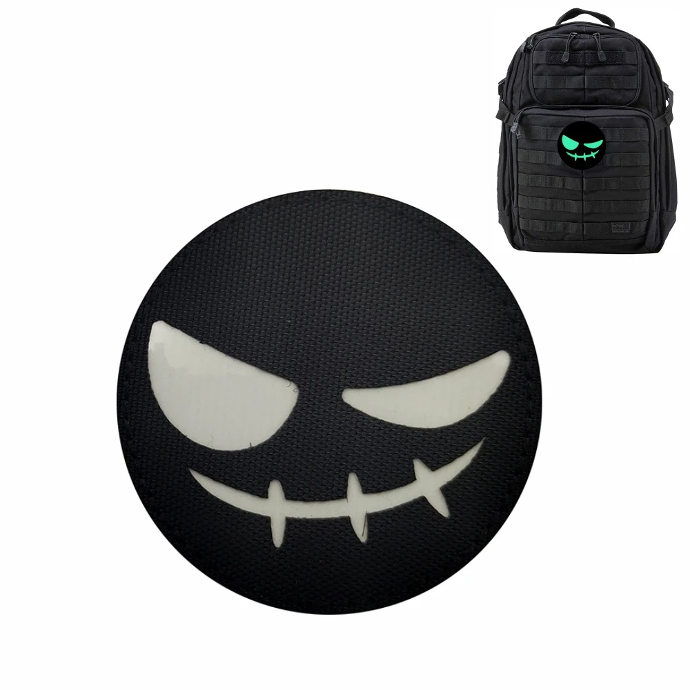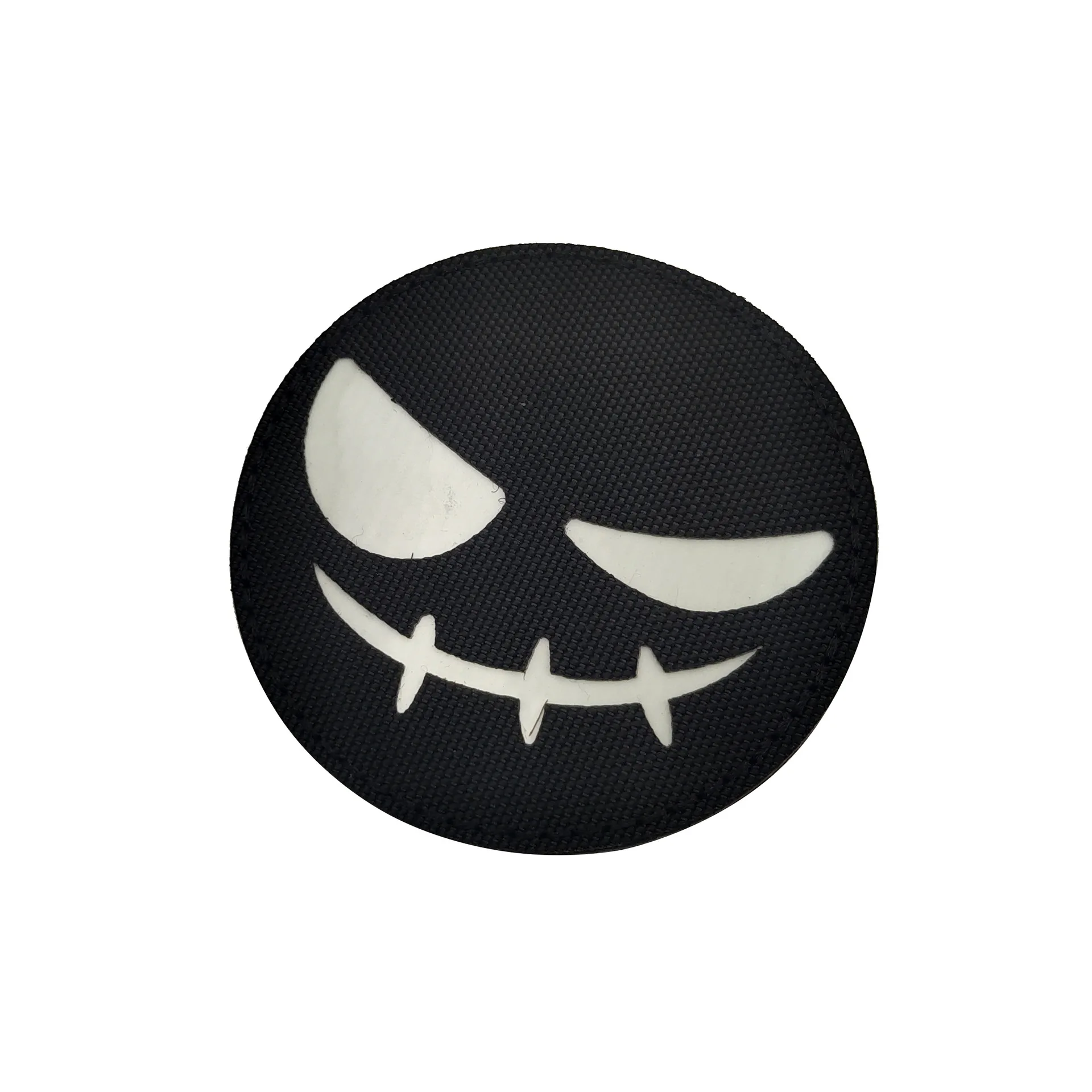 Nombre del producto:Parche reflectante de sonrisa malvada, insignia para brazalete que brilla en la oscuridad, apliques de adorno, parches tácticos militares de camuflaje