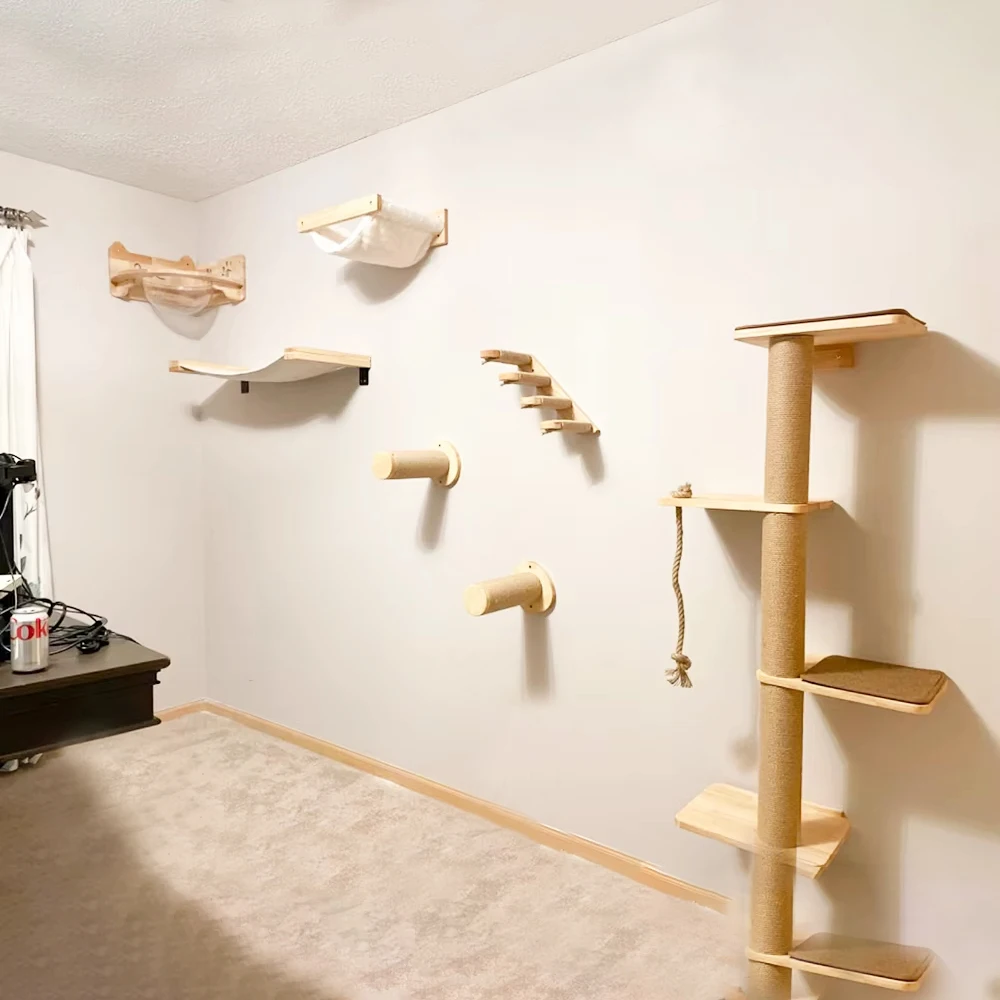 Pared de madera maciza para el hogar, marco de escalada para gatos, combinación de hamaca para gatos, plataforma de salto para gatos, escalera de escalada con columna de sisal