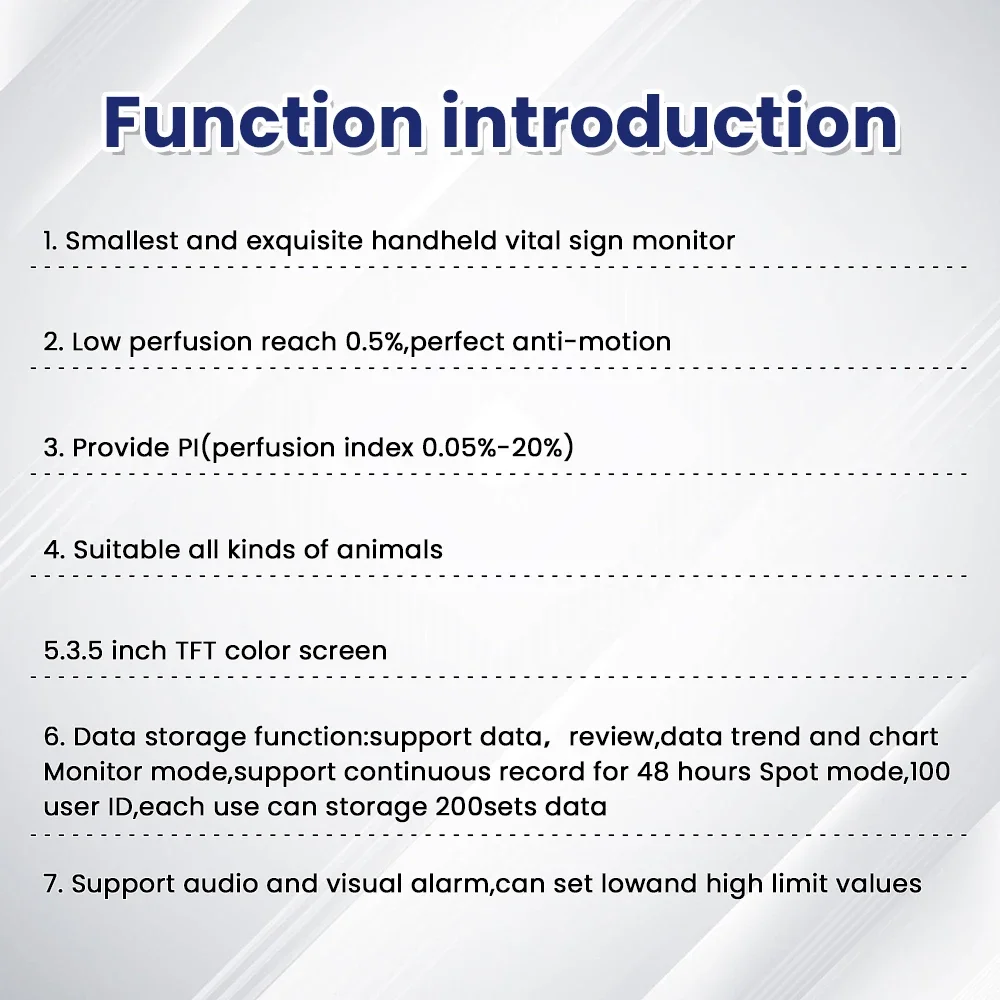 6.Función de almacenamiento de datos: admite datos, revisión, tendencia de datos y gráfico, modo de monitor, admite grabación continua durante 48 horas Modo puntual, 100 ID de usuario, cada uso puede almacenar 200 conjuntos de datos