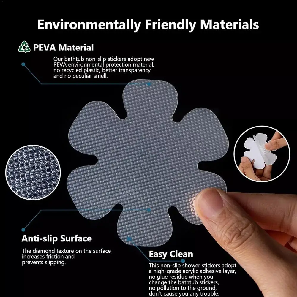 1. Seguridad mejorada en las duchas: los golpes antideslizantes en las superficies superiores de nuestras pegatinas de ducha aumentan significativamente la fricción, lo que garantiza una base segura. Su fuerte adhesivo se adhiere fácilmente a varias superficies, lo que las hace fáciles y duraderas.
