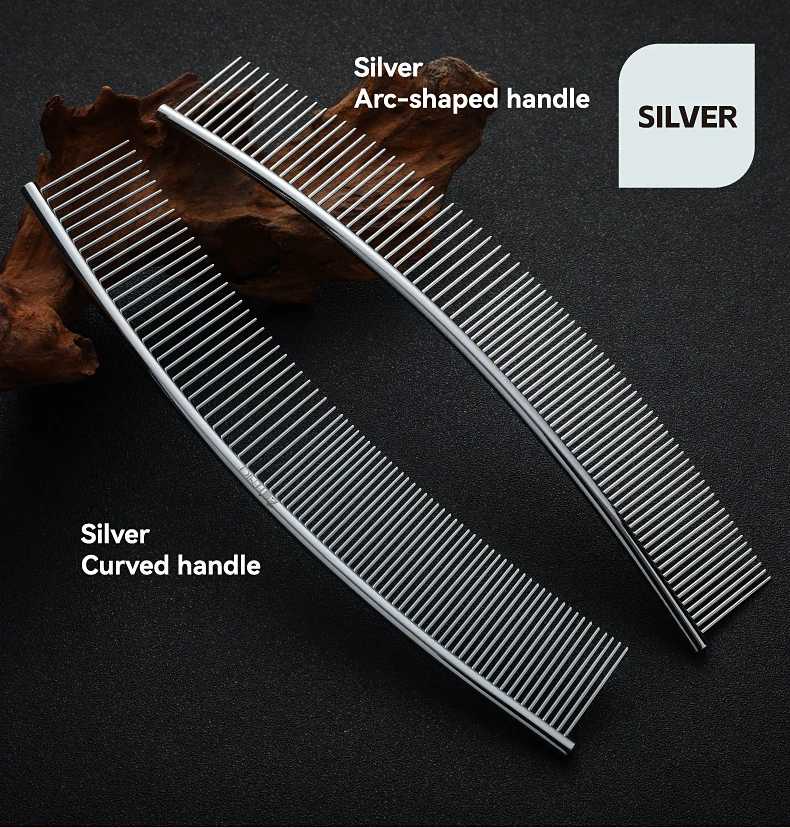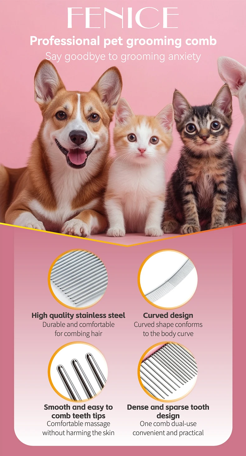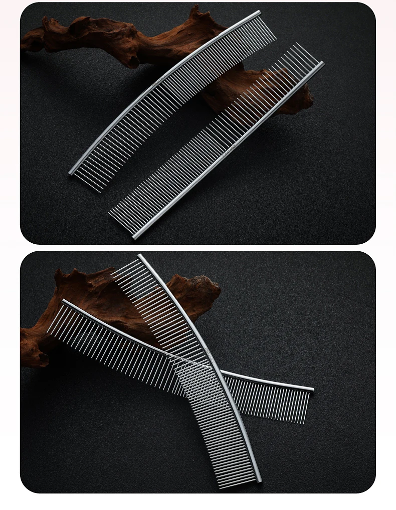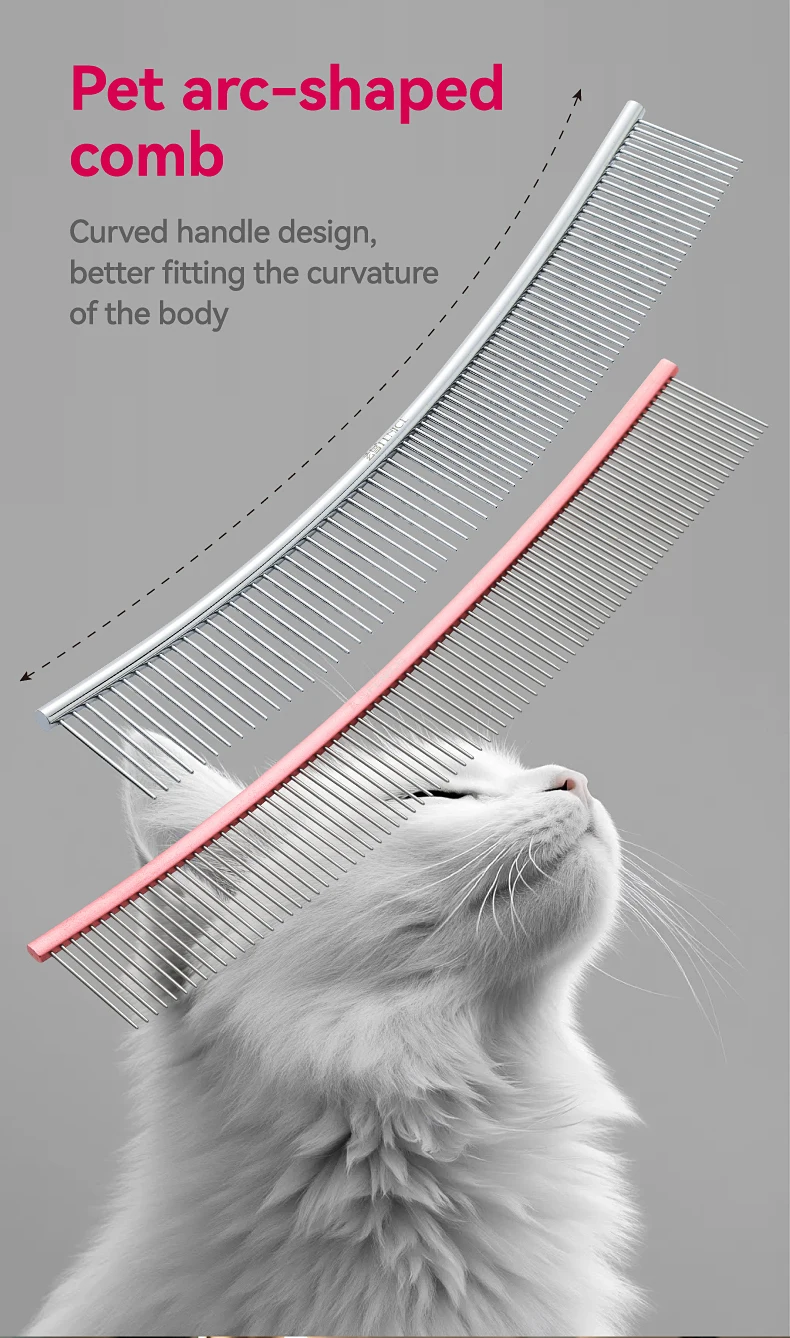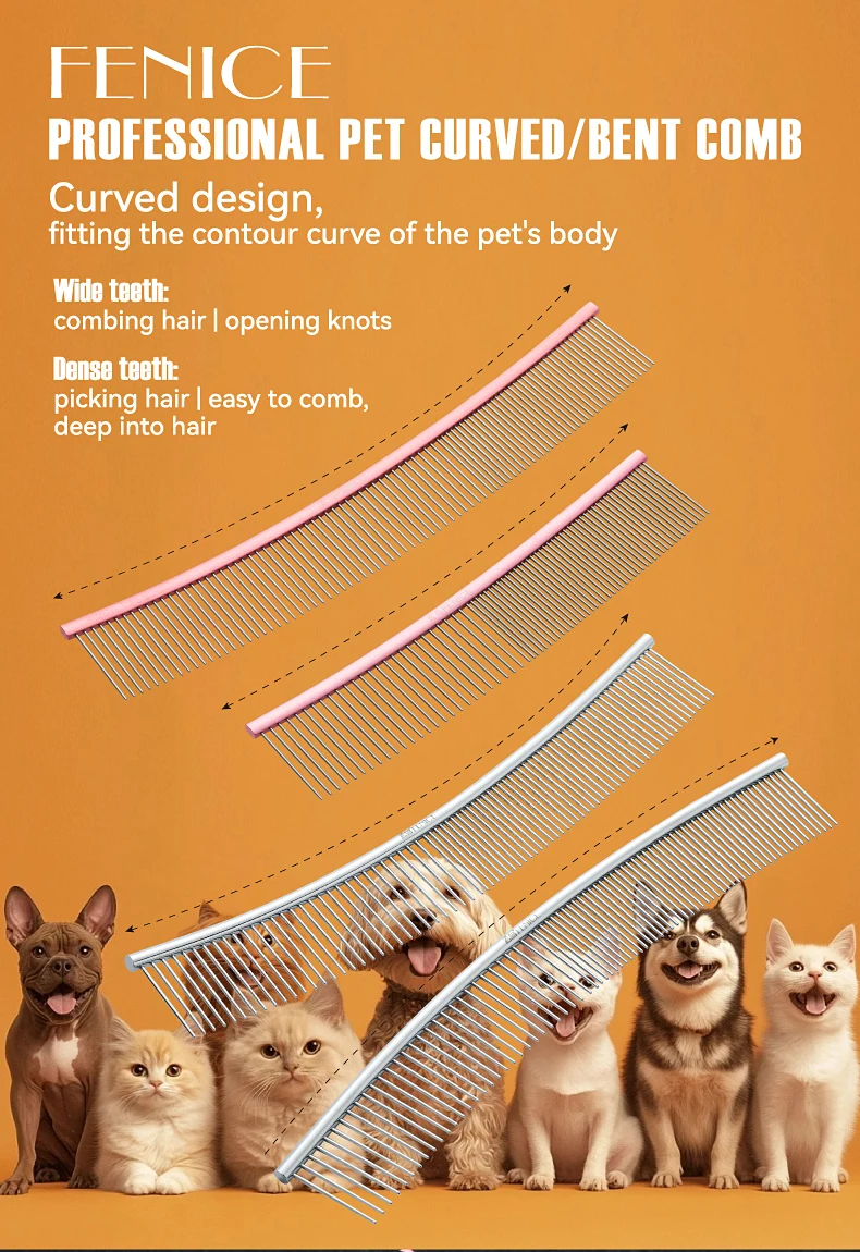 Peine de aseo curvo para mascotas Fenice, cepillo de acero inoxidable en forma de arco con dientes densos y esparsos para perros y gatos, suministros de aseo para mascotas