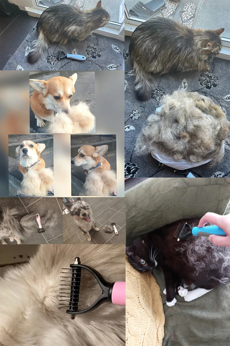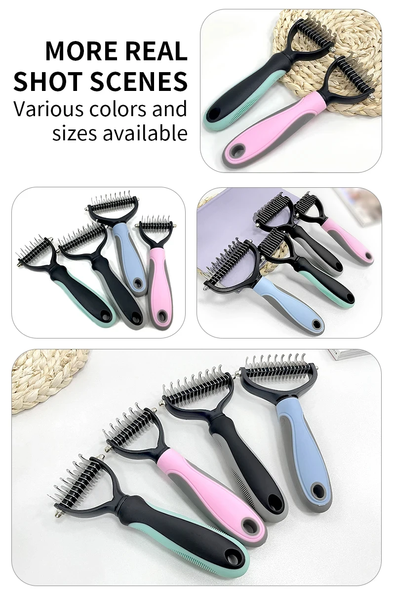 1. Peine: nuestra herramienta de aseo para mascotas no solo funciona muy bien como cepillo de desenredado o peine para desenredar, sino que también puede usarla como peine de rastrillo o rastrillo para desenredar.
