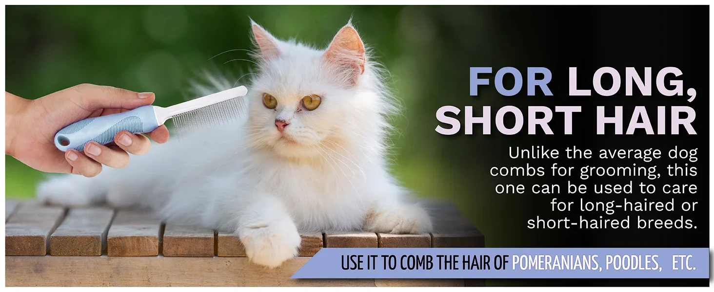 PARA CABELLO LARGO Y CORTO: A diferencia de los Peines para perros promedio para el aseo, este se puede usar para cuidar razas de pelo largo o corto. Úselo para peinar el pelo de Pomerania, Caniches, gatitos persas, etc.