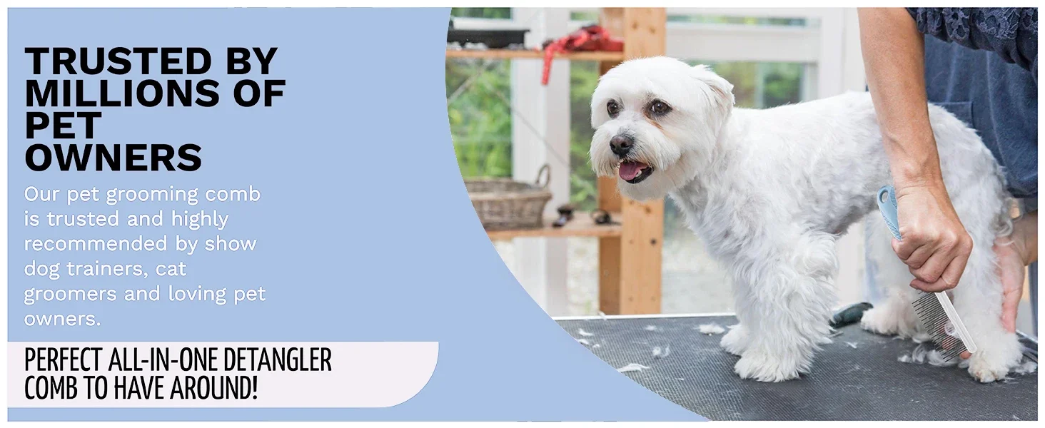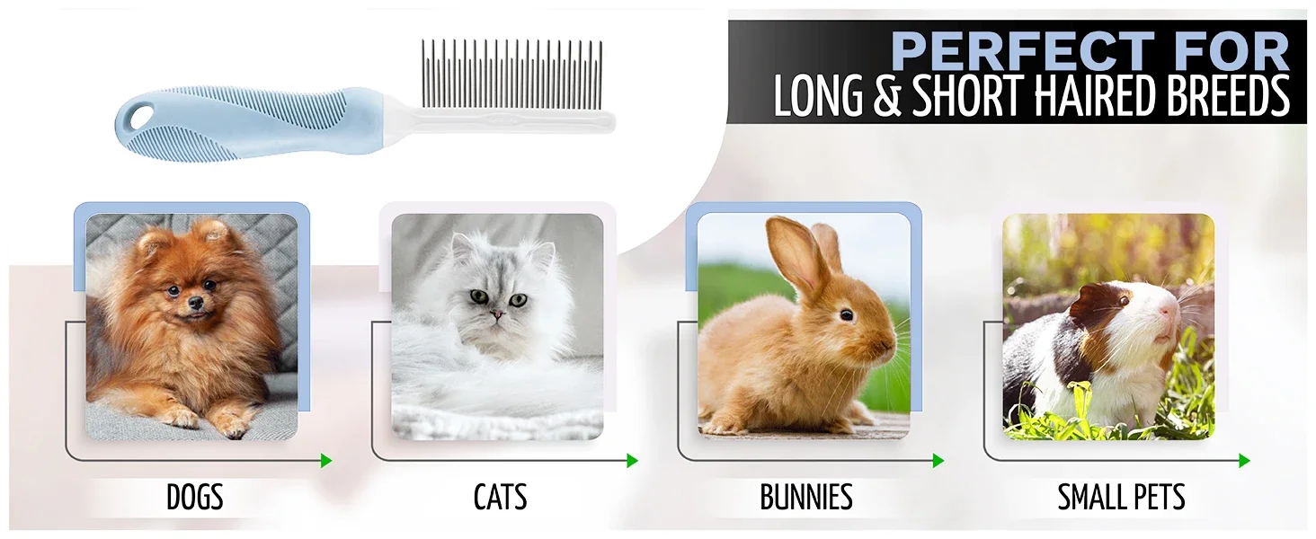 HERRAMIENTA PARA MASCOTAS: Nuestros SUMINISTROS DE ASEO para mascotas vienen altamente recomendados por entrenadores de perros de exhibición, peluqueros de gatos de pelo largo y dueños de mascotas de todos los días. ¡Es el peine desenredador todo en uno perfecto para tener alrededor!