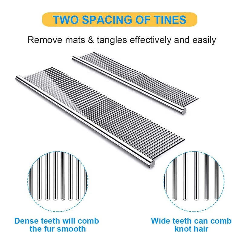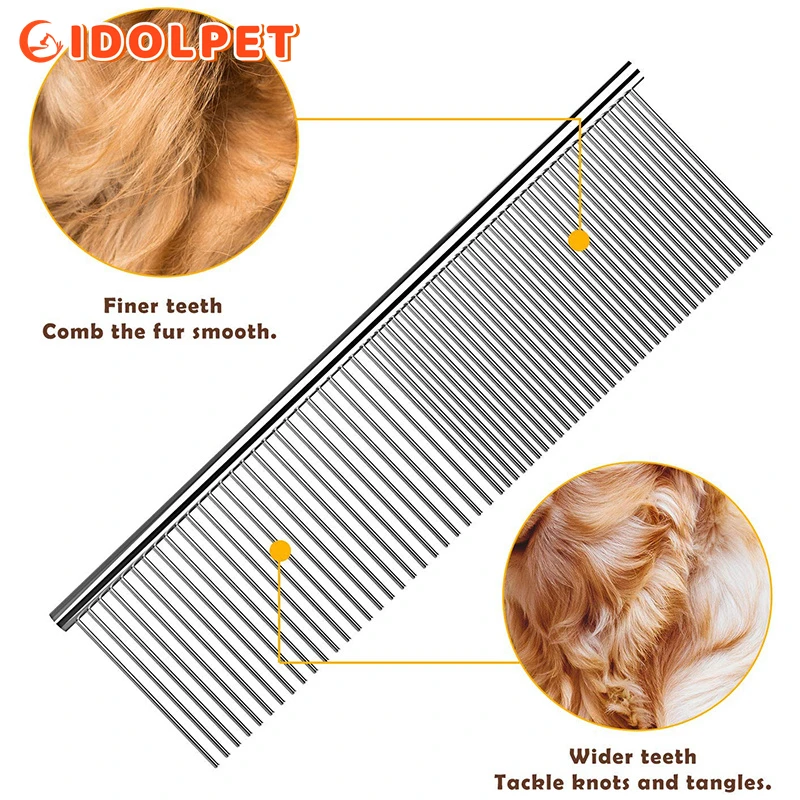 Este peine de doble propósito tiene dientes fijos anchos y estrechos. Los escasos dientes del peine pueden aflojar el cabello enredado y son adecuados para peinar grandes áreas de cabello esponjoso. Los dientes gruesos del peine Pueden peinar el cabello suave de los ojos, las orejas y las piernas.