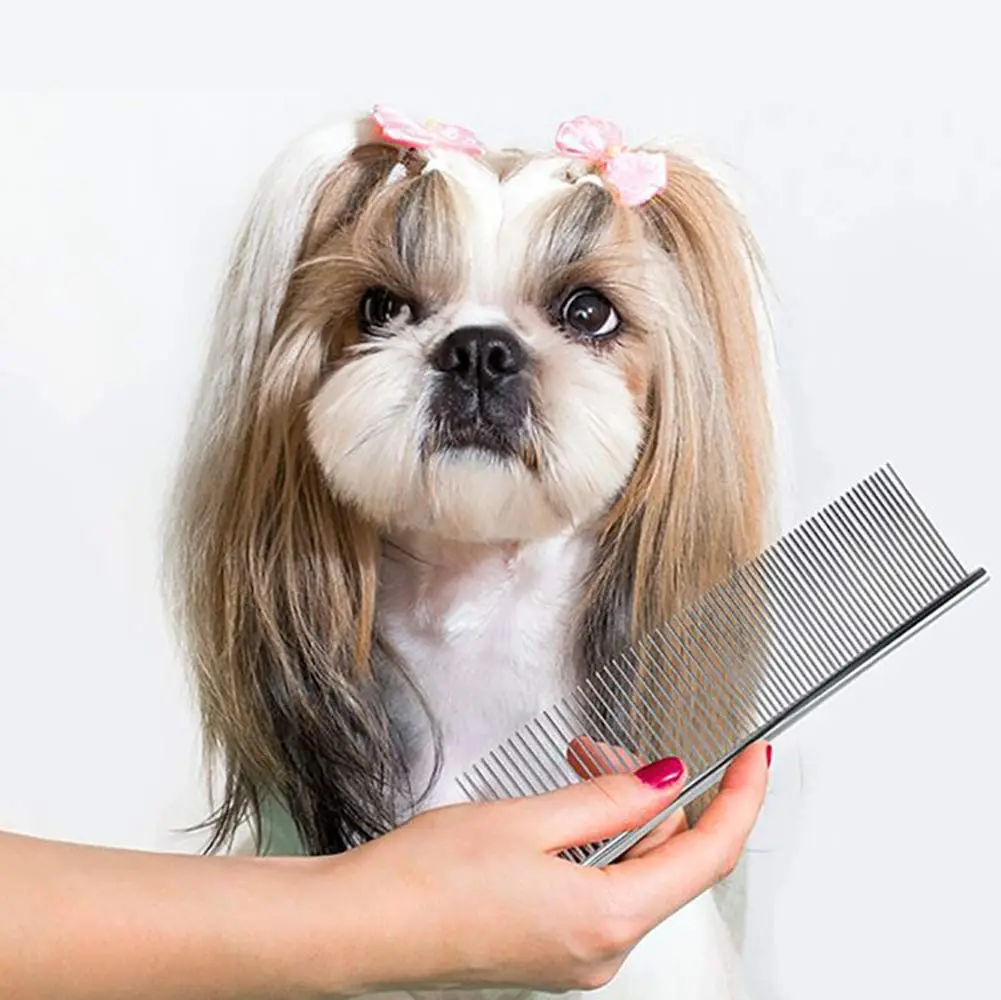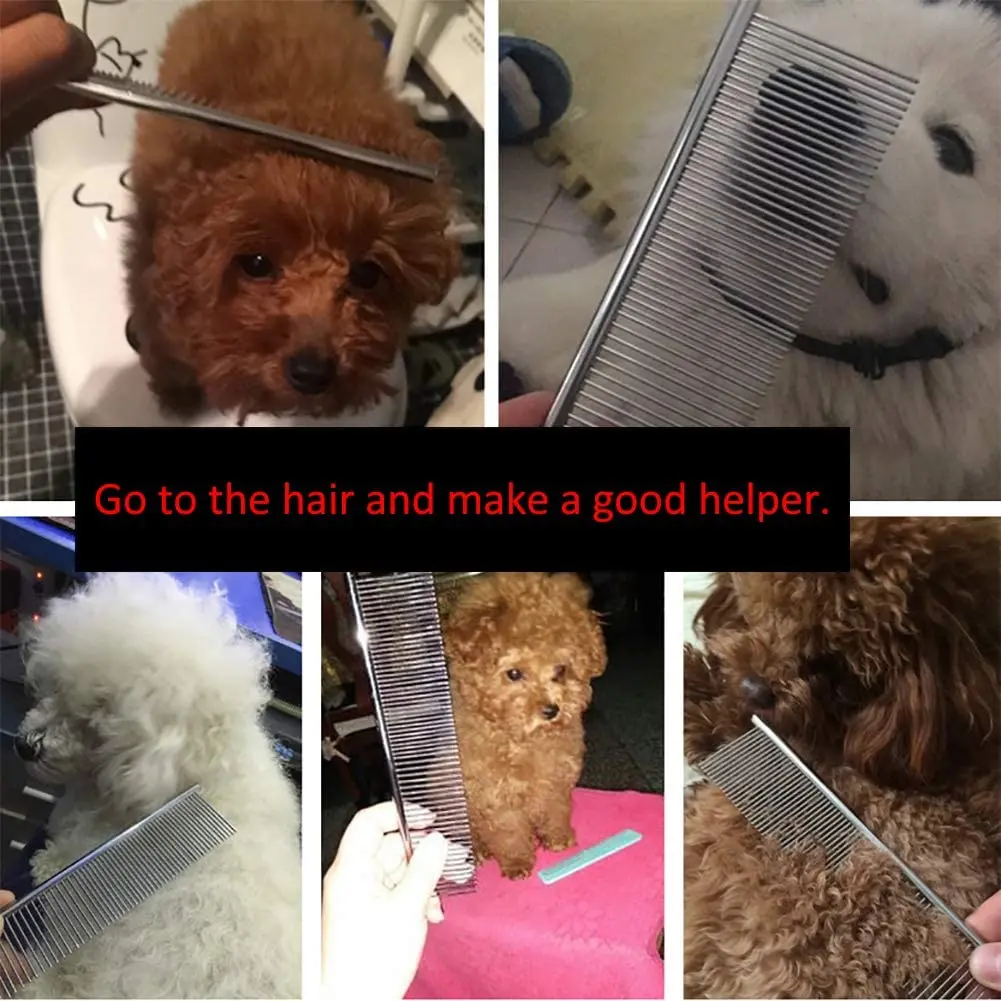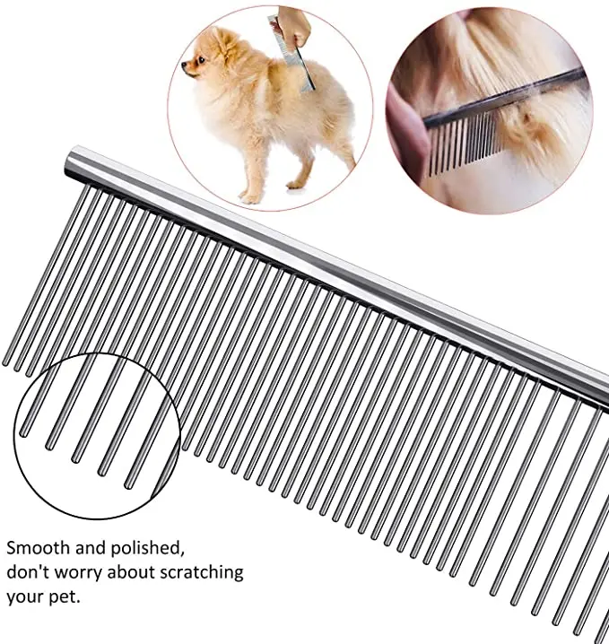 CUMPLEA TUS NECESIDADES: Los dientes anchos se pueden usar para peinar el pelaje anudado, mientras que los dientes densos son adecuados para peinar el pelaje suave cerca de los ojos, las orejas y el pelo fino de las piernas.Peina el pelaje suavemente.