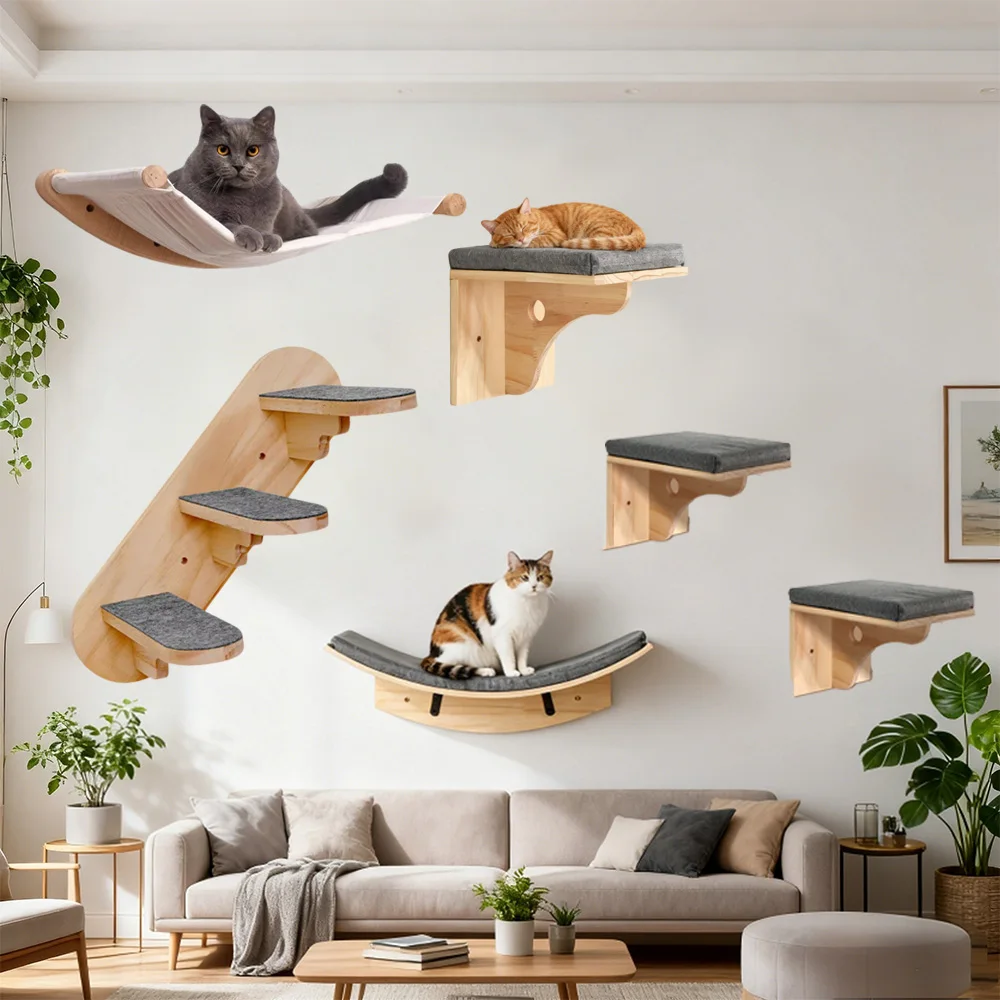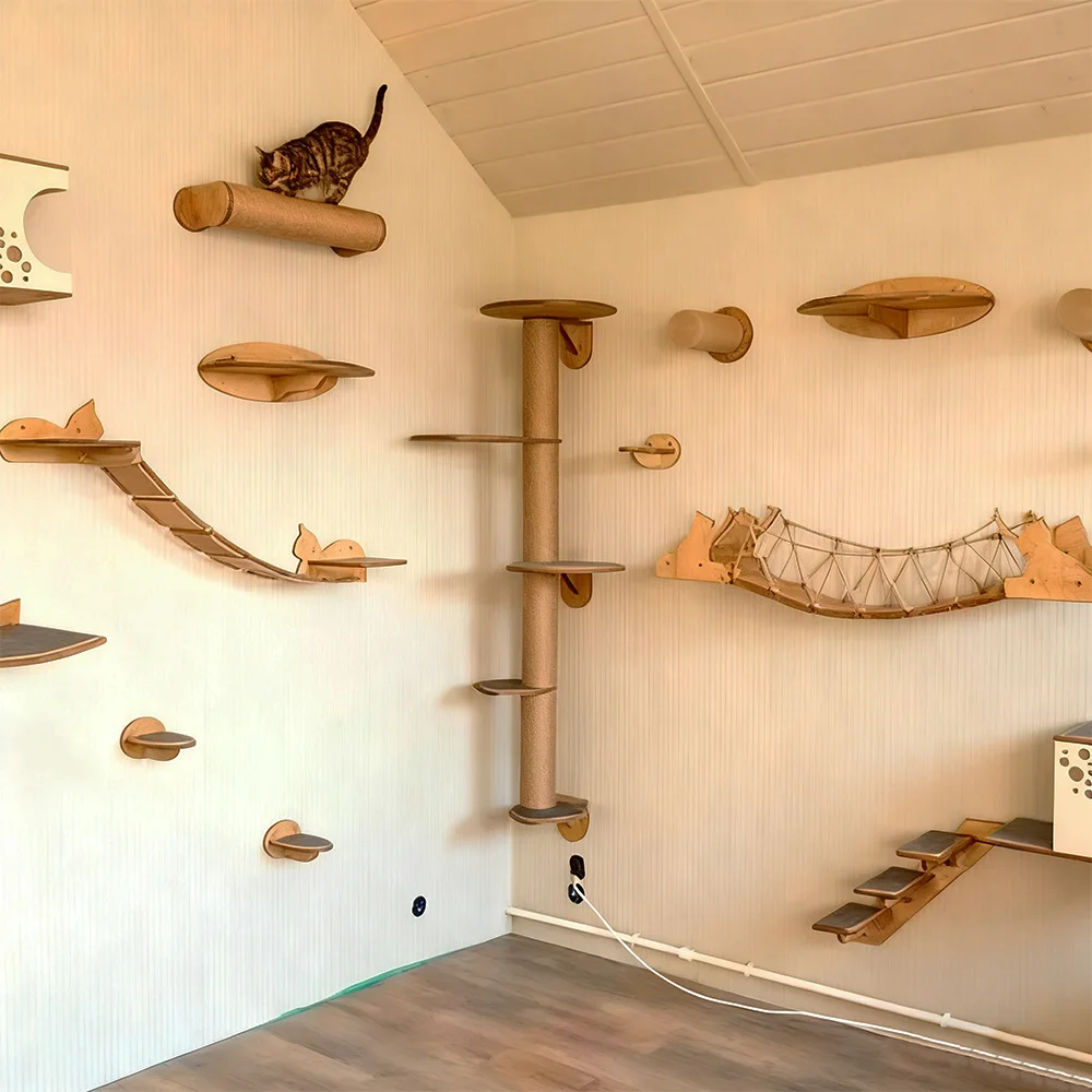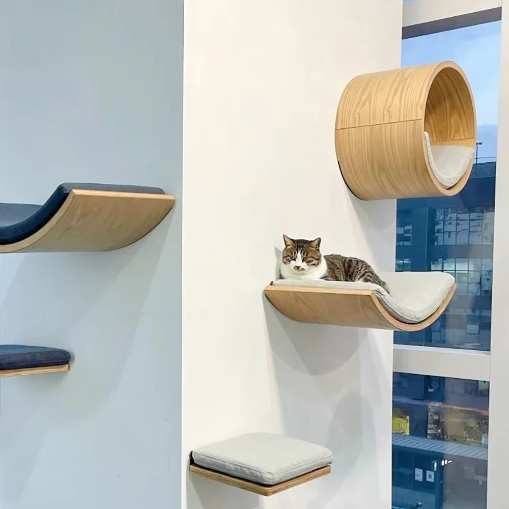 ¡Convierte tu hogar en un paraíso para gatos con nuestro estante para gatos montado en la pared!Este conjunto de muebles para gatos está fabricado en madera natural de alta calidad, combinado con cojines suaves y cómodos, lo que proporciona un lugar ideal para que los gatos domésticos trepen, descansen y observen su "territario".Ya sea que viva en un apartamento pequeño o en una mansión espaciosa, el diseño que ahorra espacio no solo satisface la naturaleza de los gatos, sino que también agrega estilo a su hogar.