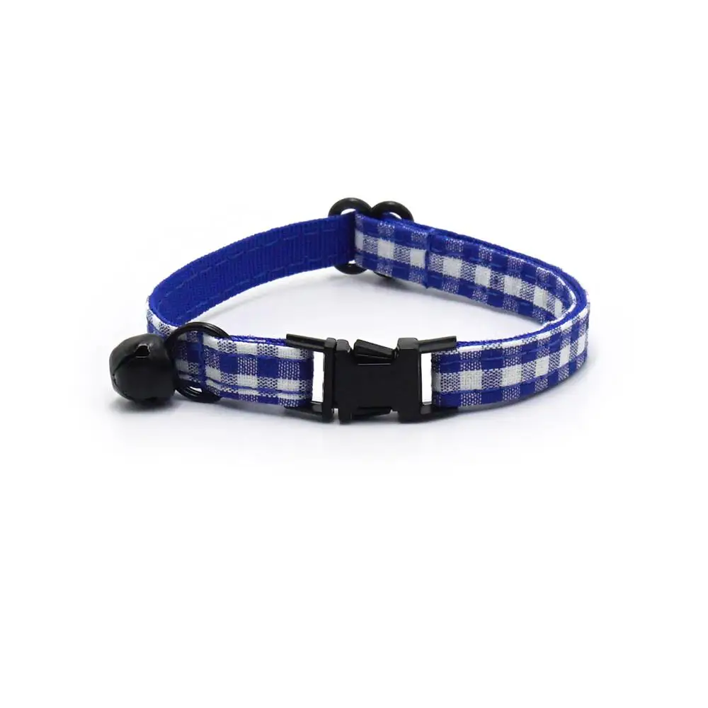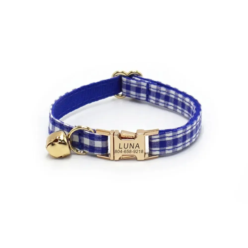 Nombre del producto: Collar de gato personalizado, contacto con nombre de identificación personalizado, hebilla de metal, collares de gato a cuadros blancos azules ajustables con campana