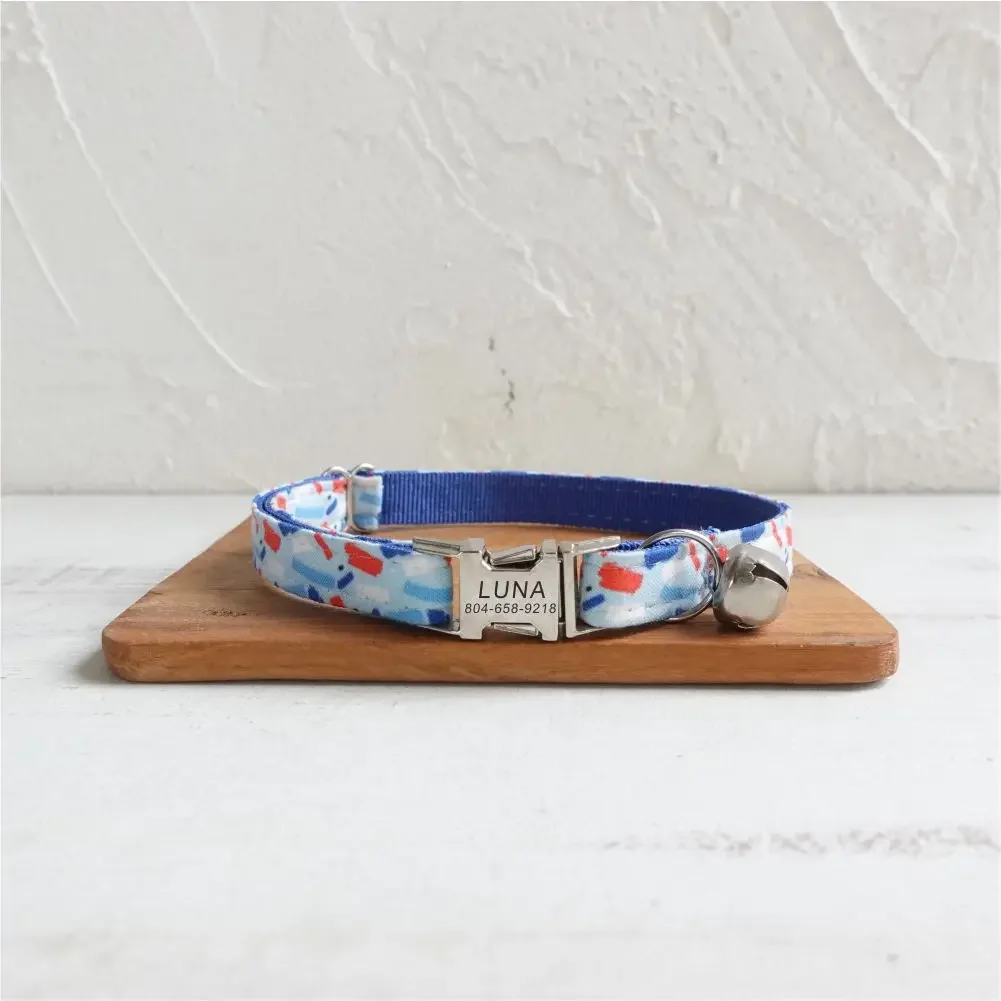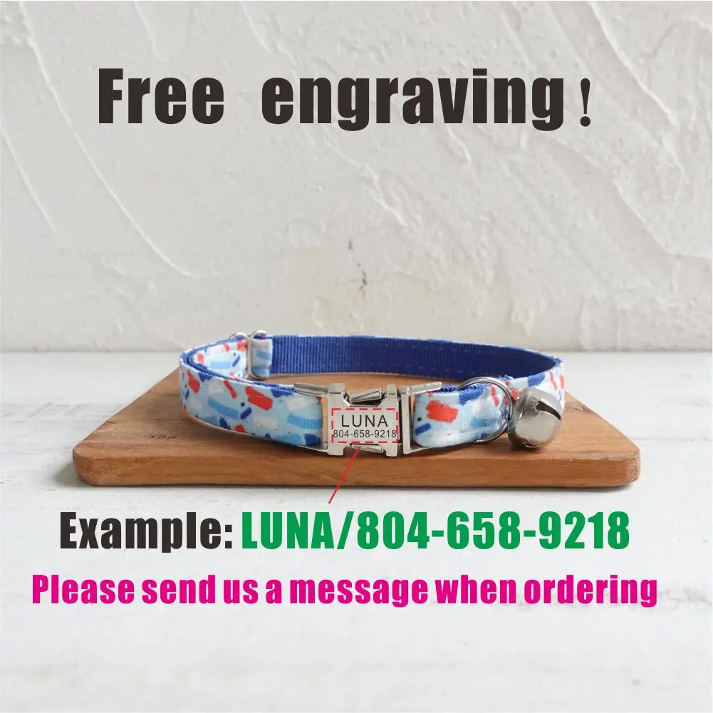 Nombre del producto: Collar de gato personalizado, contacto con nombre de identificación personalizado, hebilla de metal, collares de gato de terciopelo de caramelo de dibujos animados ajustables con campana