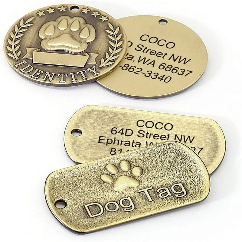 Etiqueta de identificación de mascotas grabada personalizada para etiquetas de placa de identificación de bronce para perros y gatos personalizables