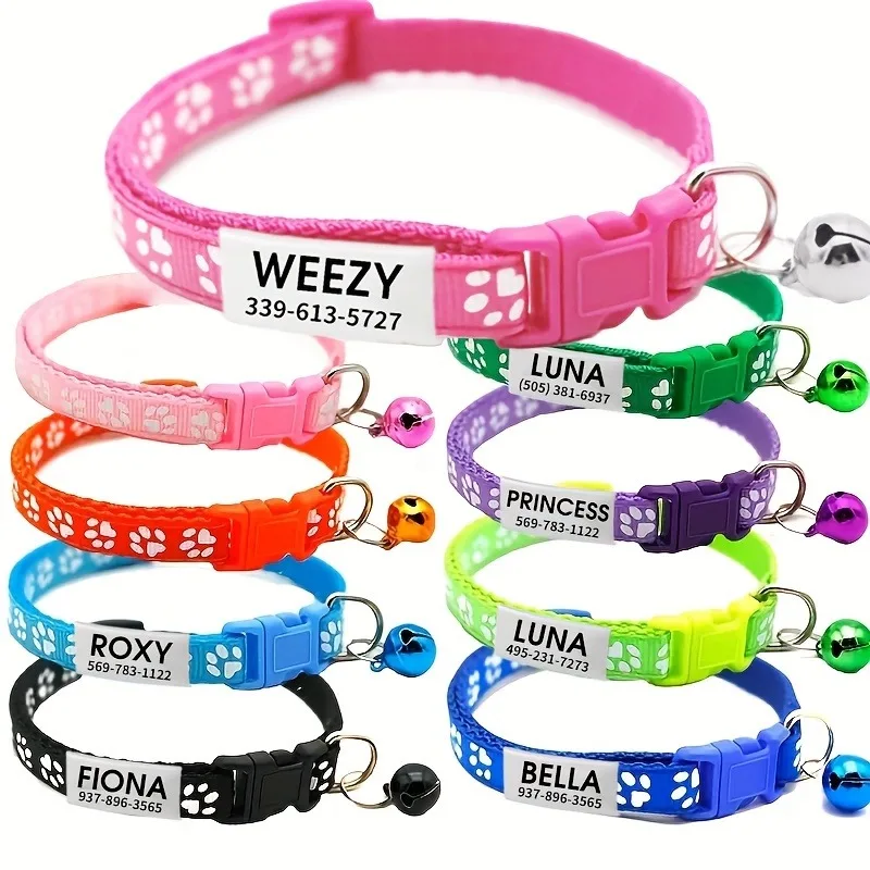 Etiqueta de identificación personalizada, Collar de pata de gato, campana grabada, etiqueta con nombre de mascota, perro pequeño, nailon ajustable para collar de cachorro y gatitos