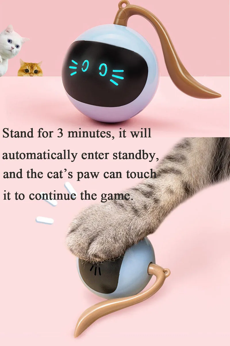 Long press the power switch to start, click the magic ball to start rolling. Stand still for 30 seconds, it will automatically enter the standby state, and you can continue the game by touching the cat's paw.