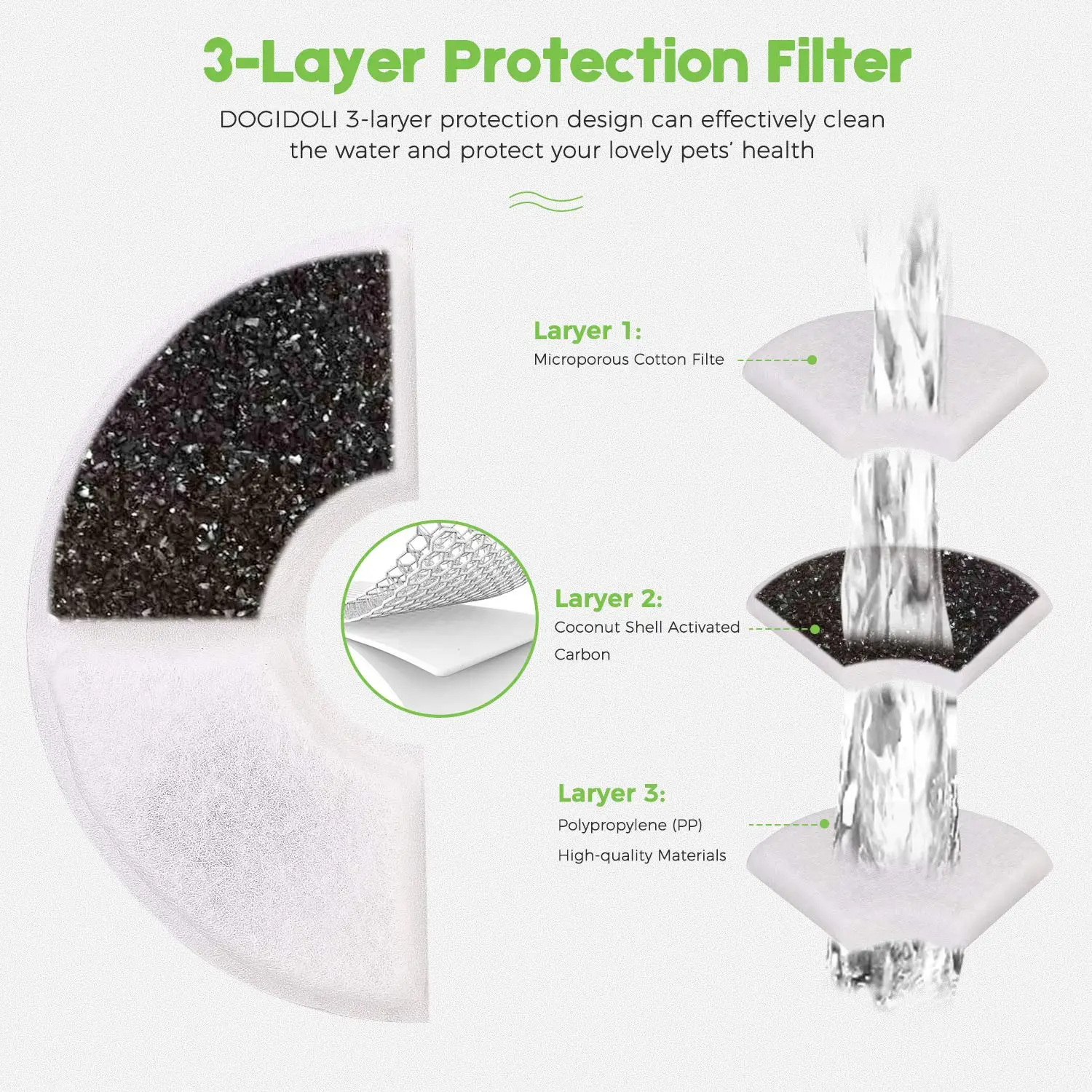 1, MÁS 50% FILTRO DE CARBONO ACTIVADO: Añadir 50% de carbón activado y La Adsorción es más fuerte. Mejor calidad del agua, mejor para sus mascotas. 2, PURIFICACIÓN DE DOBLE EFECTO: Filtro de fuente de flores para gatos, purificación de agua multinivel, filtrado de cabello y residuos, eliminación de olores, ablandamiento del agua 3, FRECUENCIA DE REEMPLAZO: sugerimos reemplazar el filtro de la fuente para mascotas 2-4 semanas para mantener el agua fresca y limpia 4,VALUE PACK de 6 FILTROS: Paquete de 6 filtros de carbón activado Premium hechos de carbón activado Premium + algodón, tamaño: 5,1*0,3 en 5, NOTA: (No se ajusta a la fuente de catit) Para ayudar a evitar que el polvo de carbón se desprenda, enjuague bien el filtro con agua antes de usarlo. Compatible con fuente de flores automática a continuación y otras del mismo tamaño