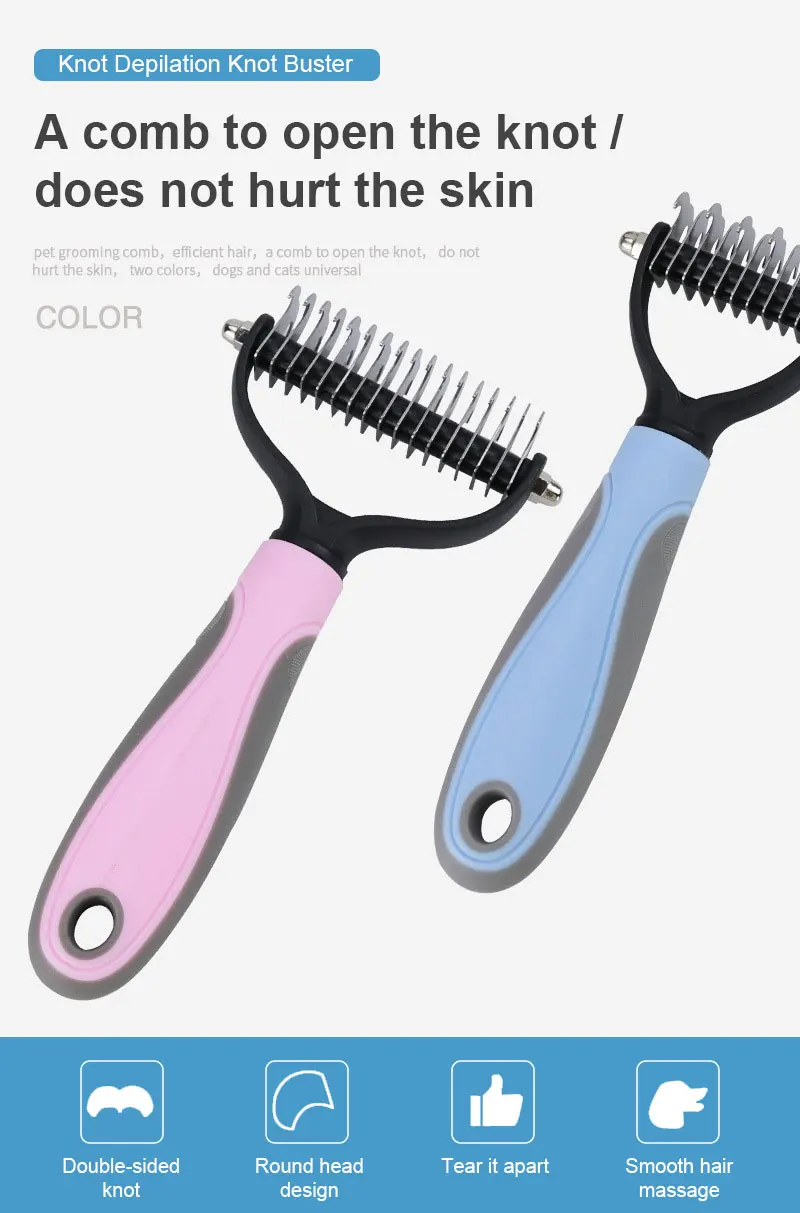 El peine de nudos para mascotas adopta un diseño de doble cabeza, con un extremo con una aguja de acero fino, adecuado para desenredar nudos pequeños; El otro extremo tiene una aguja de acero ancha, adecuado para desenredar nudos más grandes y satisfacer las necesidades de diferentes condiciones del cabello.