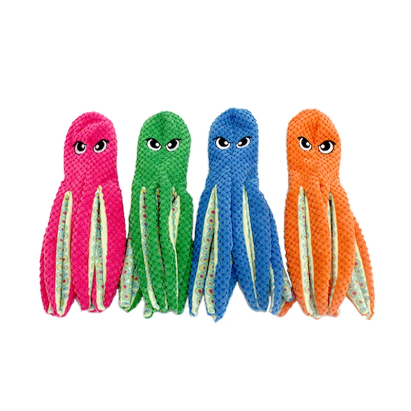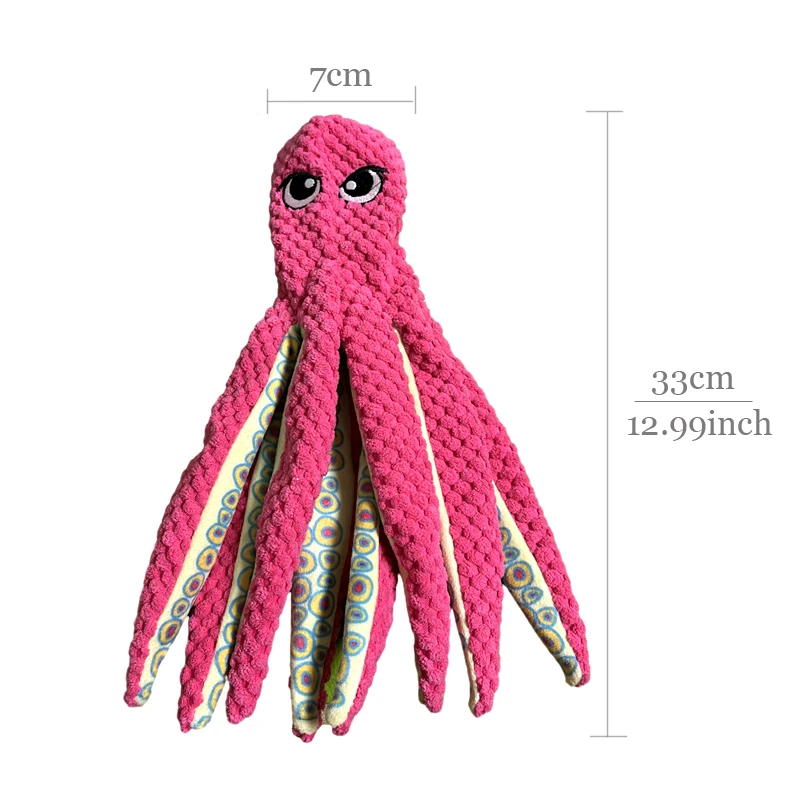 Estos divertidos juguetes para perros sin relleno tienen colores brillantes y tienen un aspecto lindo que resulta muy atractivo para las mascotas.El exclusivo juguete para perros pulpo es suave y liviano, perfecto para que su cachorro se tire y mastique y mantenga a su perro interesado.Es un gran regalo para cachorros, perros pequeños, medianos y grandes.