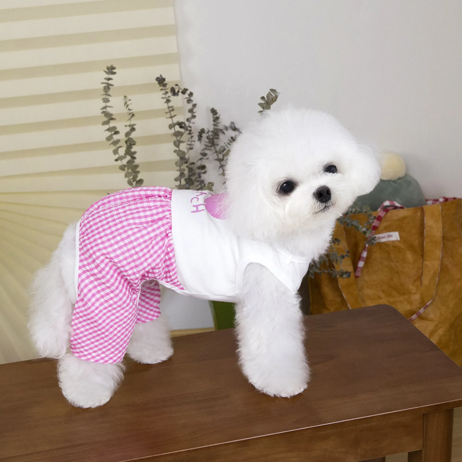Pet Primavera Verano mono de retazos a cuadros ropa de dormir de casa de cuatro patas Teddy perro pequeño mascota verano pantalones de cuatro patas