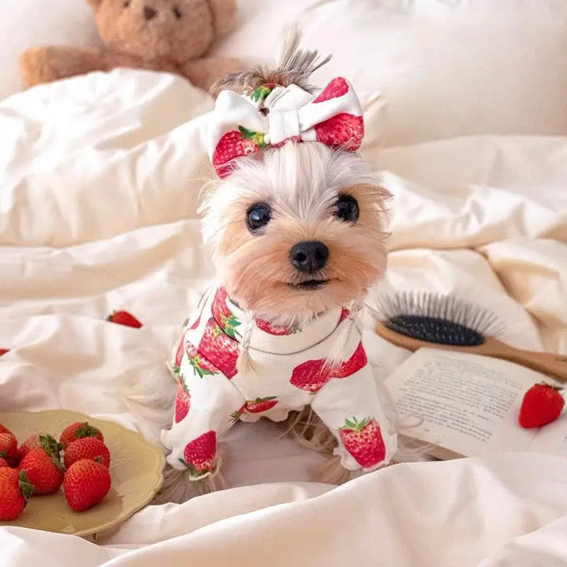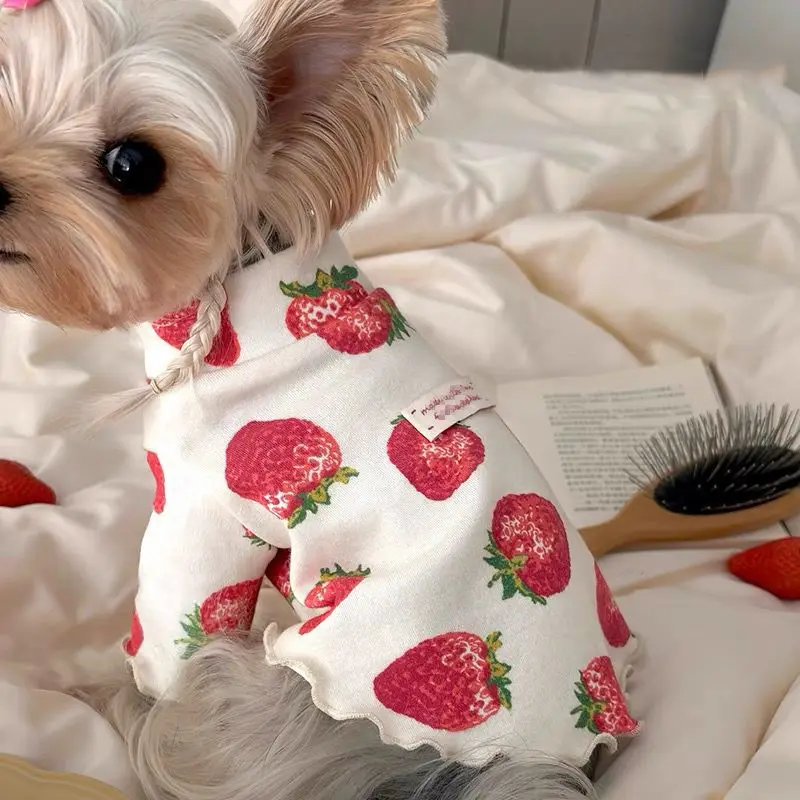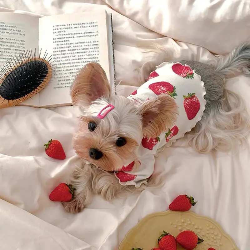 Pet Spring Strawberry Base Vest Cat and Puppy Home Base Shirt Strawberry Printed T-shirt Pet Clothes Cute Small Dog
