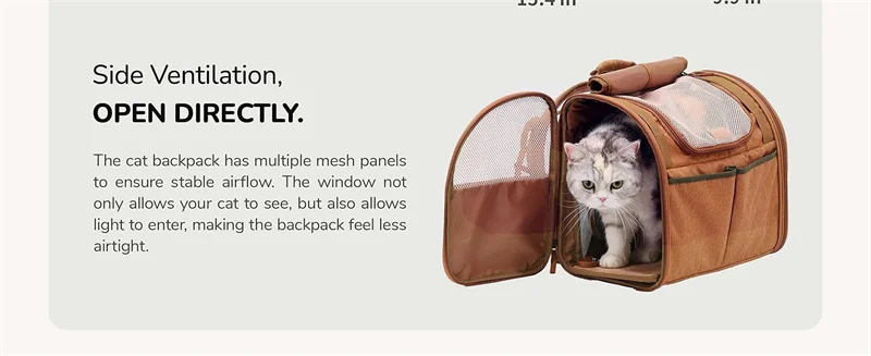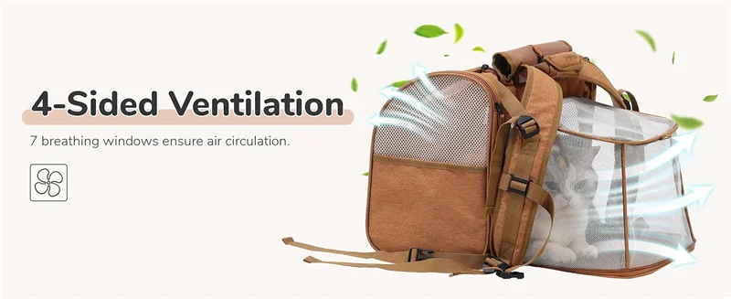 Ventilación y visibilidad: una buena ventilación es crucial para que los gatos se sientan cómodos mientras viajan. La tela de malla no solo permite que su gato vea, sino que también permite que entre luz, lo que hace que la mochila para gatos se sienta menos hermética.