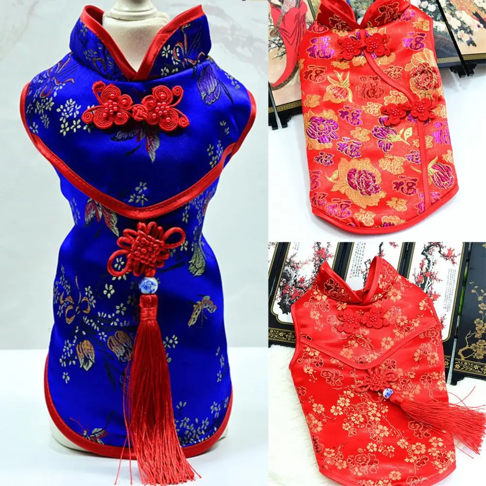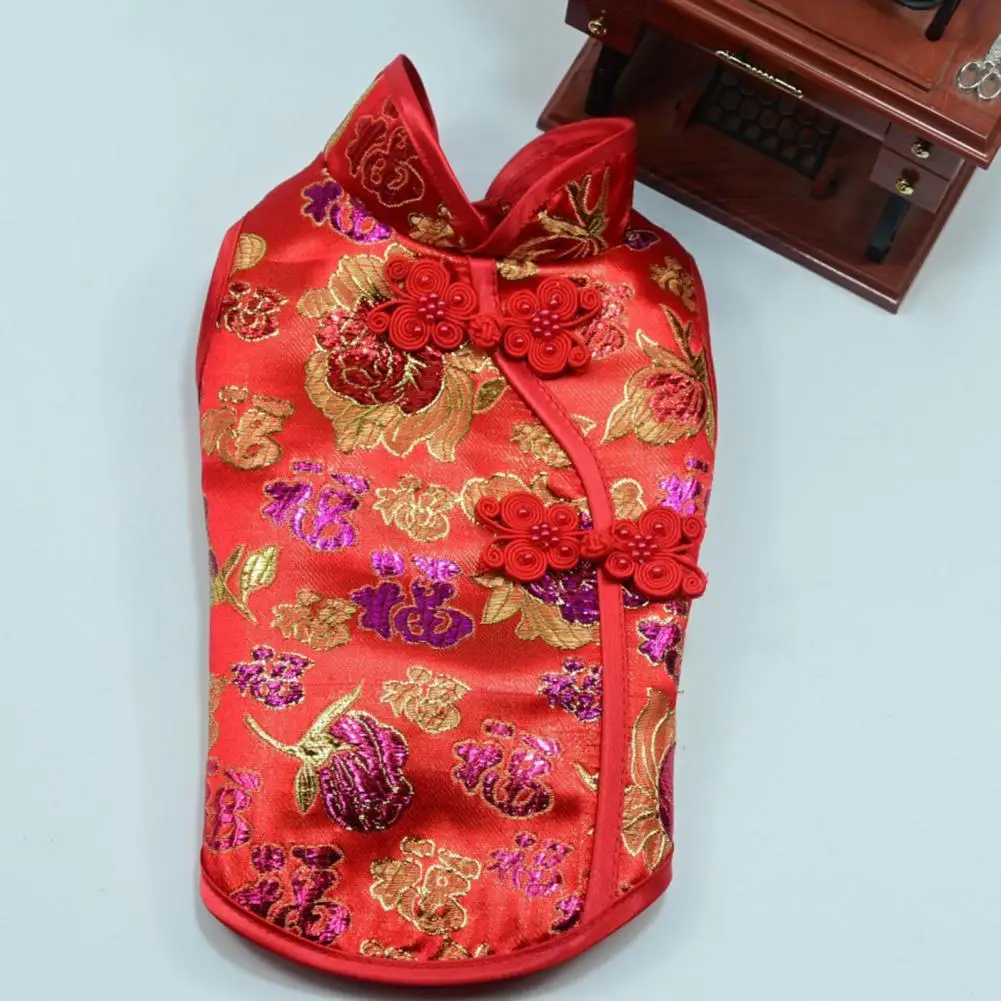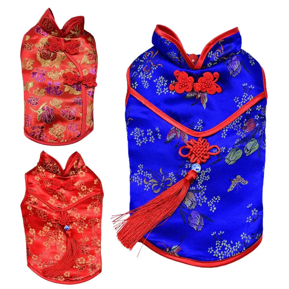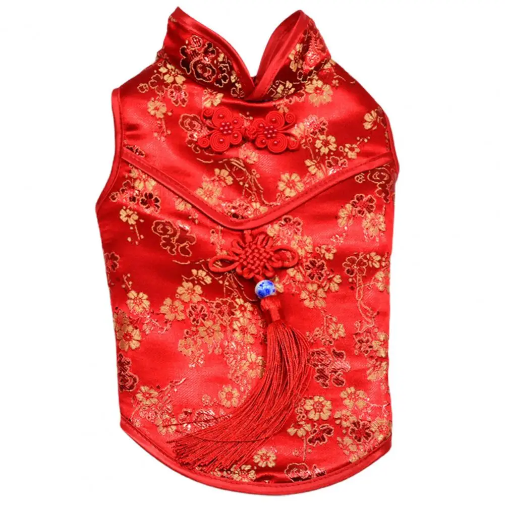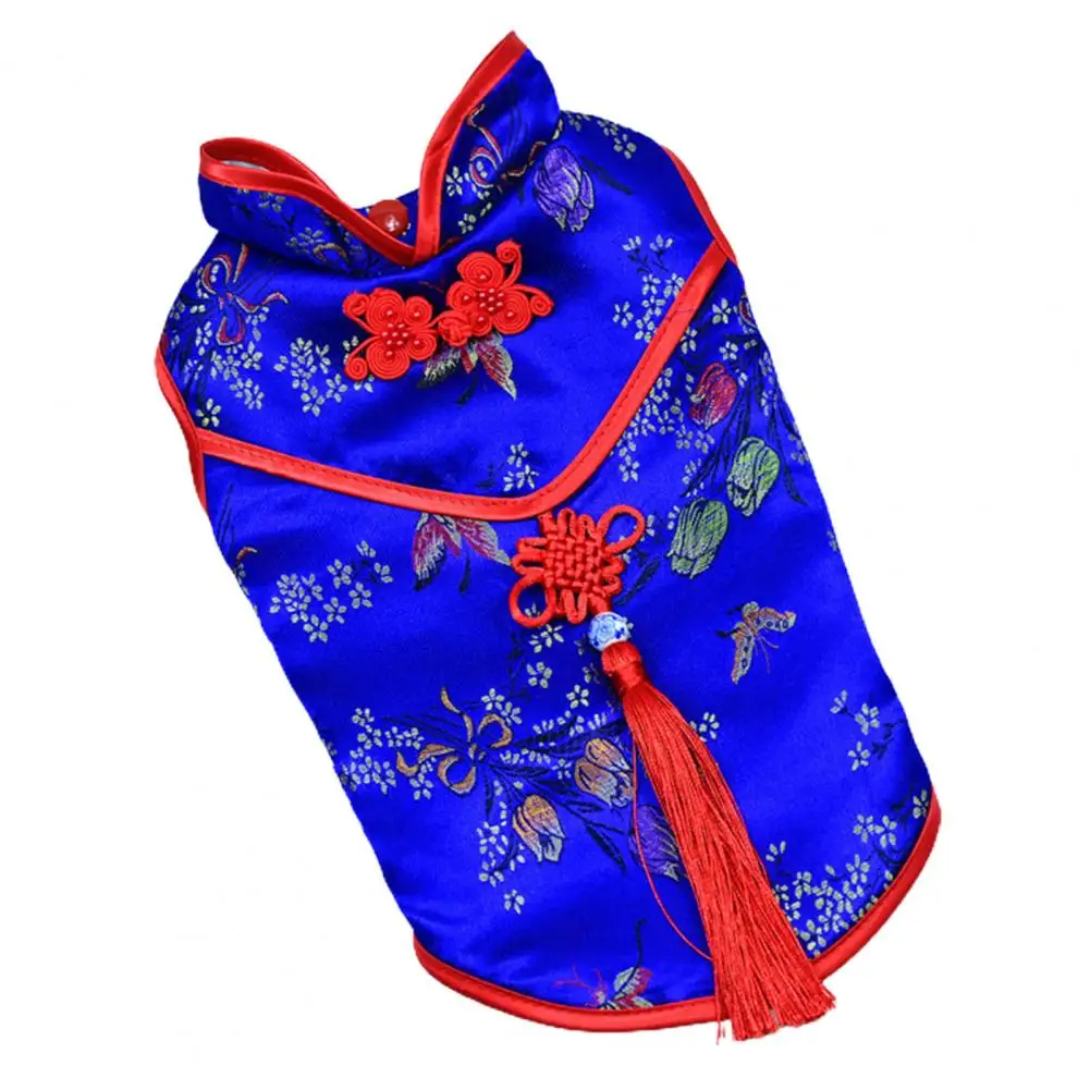 Impreso con un patrón de flores y un diseño de nudo chino, el cheongsam para mascotas es llamativo y moderno.