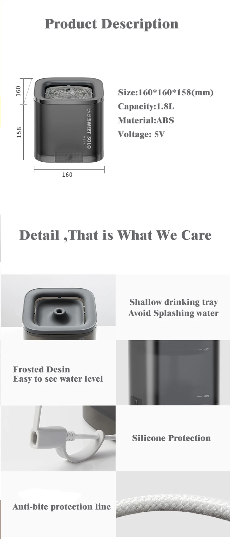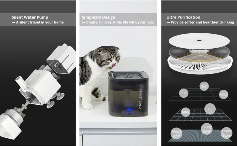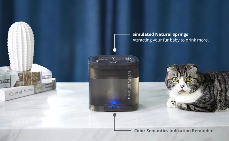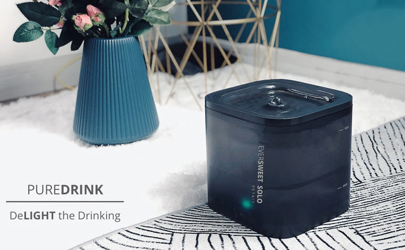 Product description: 【Reliable PureDrink Water Fountain】1.85L water capacity automatic water fountain is great for small to medium sized pets. The circulation system helps provide healthy and hygienic water. And the pump will shut off automatically, when it senses the lack of water in the fountain 【Monitor Your Pet's Water Intake】Designed with translucent material, this pet fountain water bowl offer a better view to monitor the overall water consumption of your pet. Made of food grade materials, more durable, this automatic water bowl is easy to operate and clean 【Ultra-Quiet and Auto Power off Pump】The pump is ultra-quiet (measured below 40dB) and has low energy consumption, which which give you and pets 100% sweet sleep. You can hardly hear the sound. Pump is replaceable and easy to clean 【Smart LED Indicator Light】Embedded LED lights can easily remind you the fountain working status. It will indicate water shortage and when you need to replace the filter. Just Double Click the button, working mode between Smart and Normal will be switched 【Triple Filtration System】The cat drinking fountain is equipped with high performance purifying filter which is composed of a cotton layer, coconut shell activated carbon and an ion exchange resin. They form a triple filtration system to provide healthy, running and oxygen-enriched water for your pets
