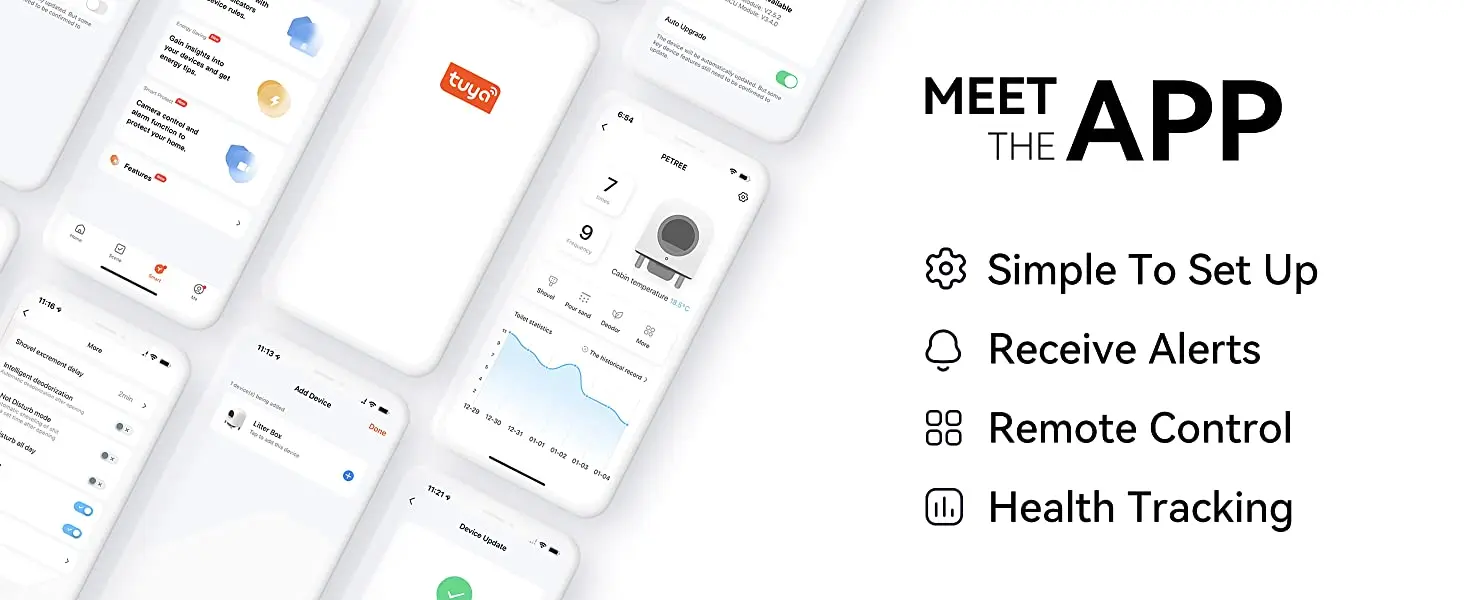 NO MÁS RECOGIDAS: elimina automáticamente todos los desechos para su comodidad y está diseñado para el estilo de vida moderno. La aplicación le permite controlar la caja de arena automática para gatos en cualquier momento y en cualquier lugar.
