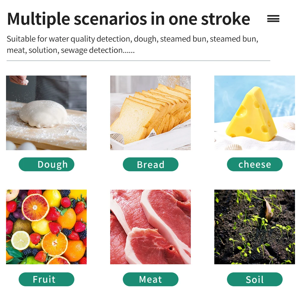 Este medidor de PH penetrante portátil es adecuado para uso en procesamiento de alimentos, como frutas, verduras, mermelada, pasta, pan, gel, algunos tipos de carne y más tipos de alimentos semisólidos.