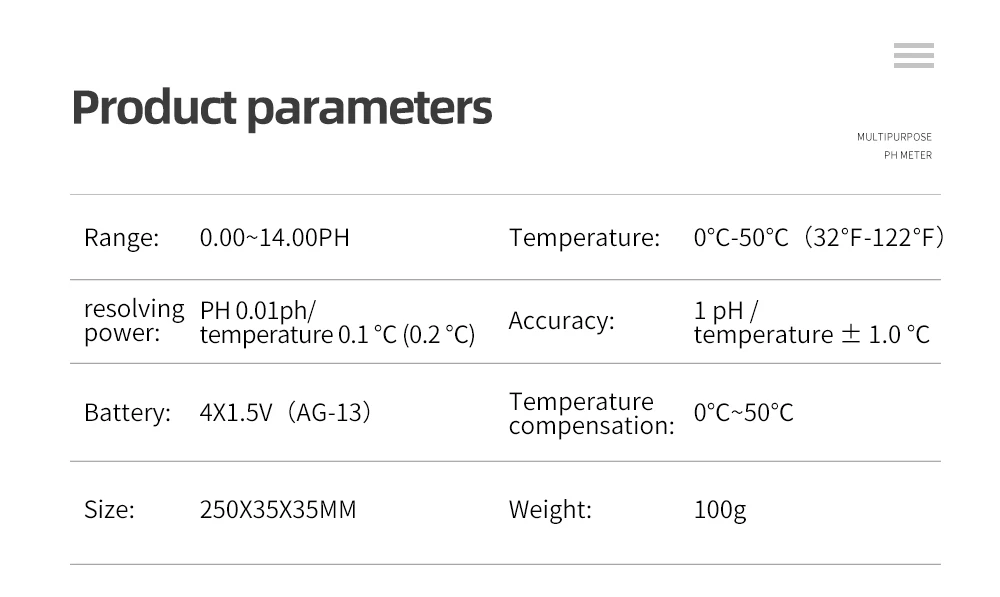 Rango: pH: 0,00-14,00 pH, temperatura: 0℃~50℃ (32°F~122°F)