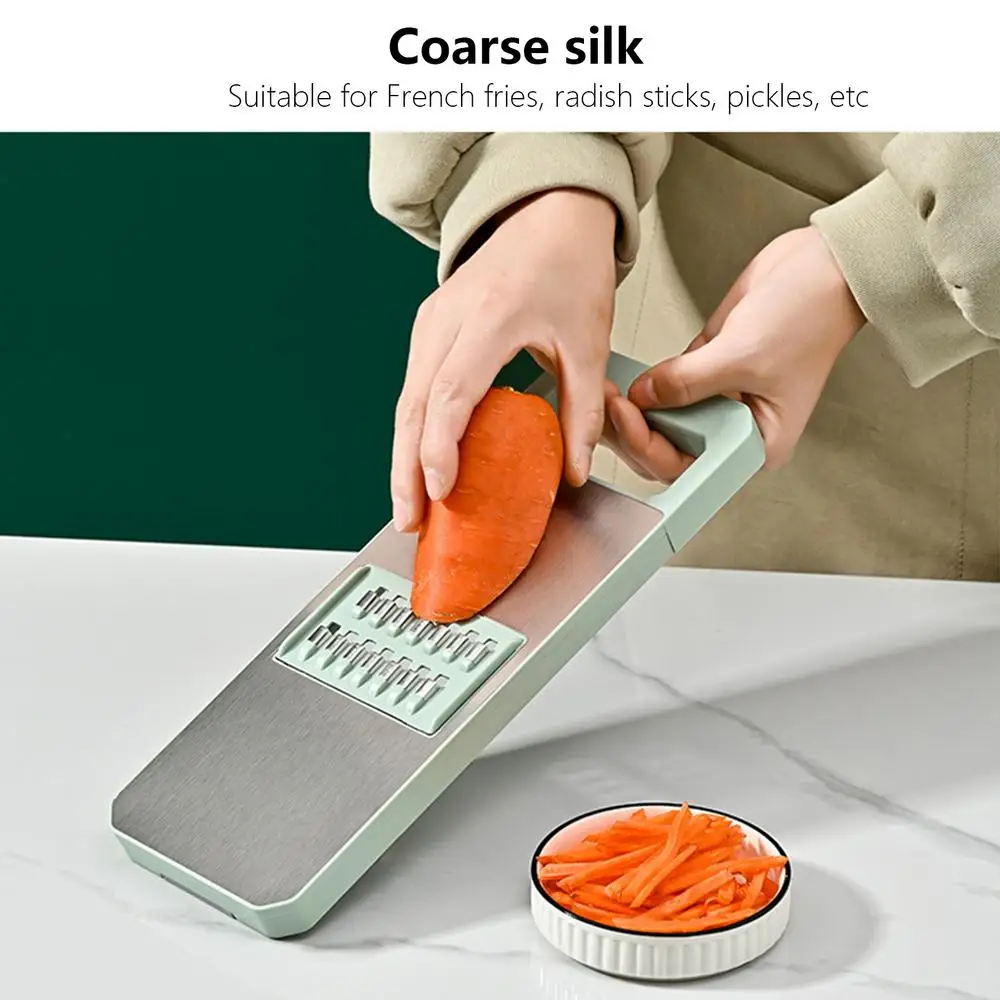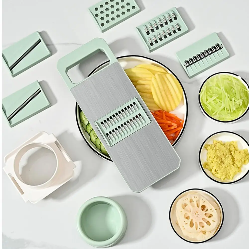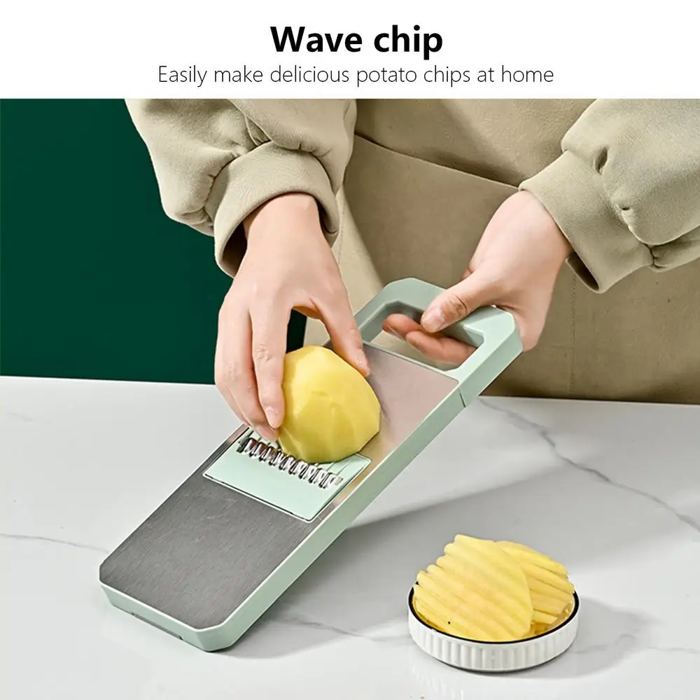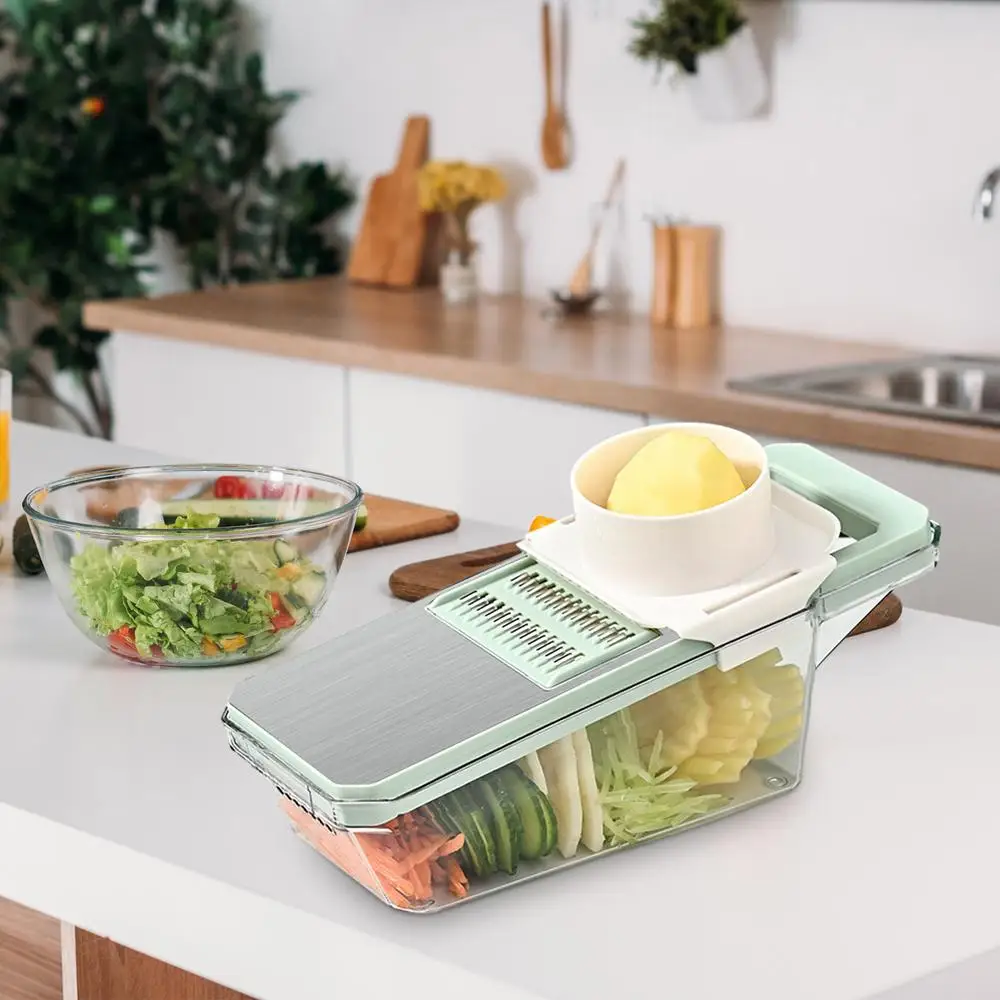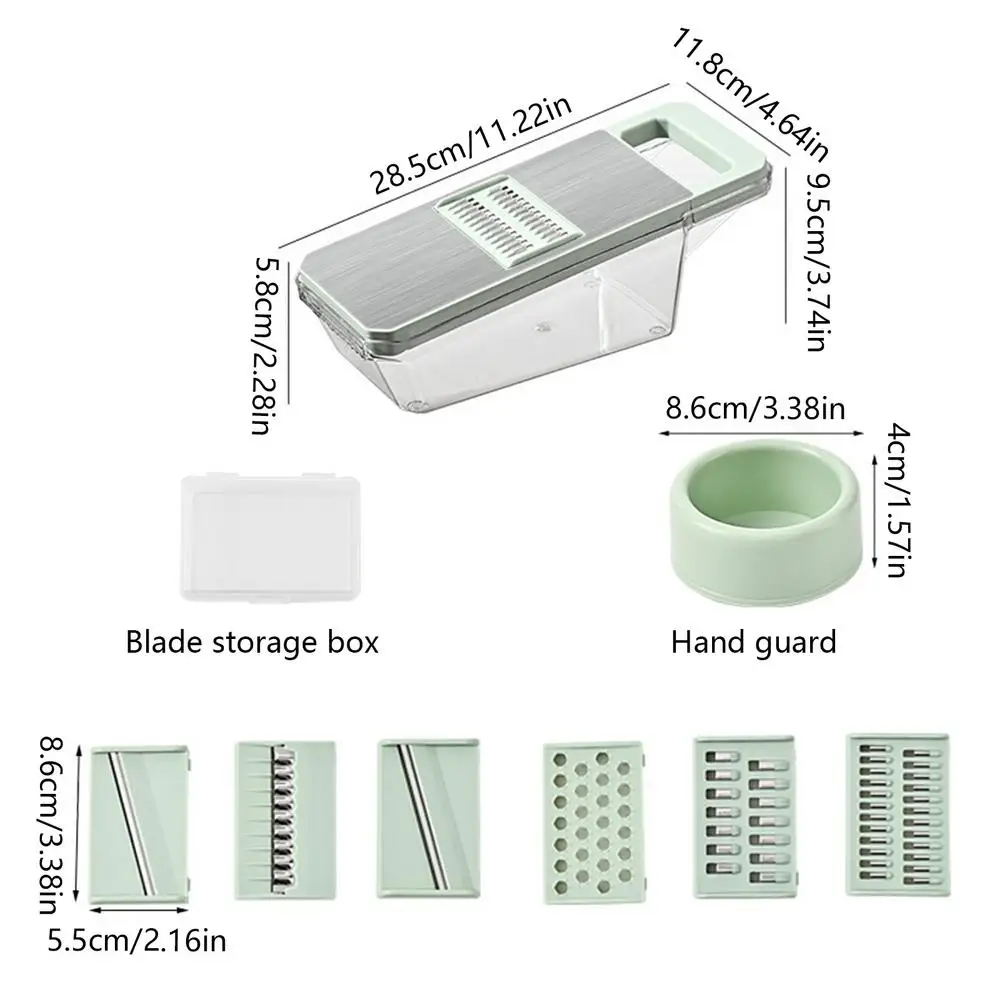 Puntos de bala: 1. Preparación de alimentos simplificada: diseñado con una cortadora de precisión y 6 cortadores particulares, este picador de verduras reemplaza numerosas herramientas de cocina. Cree cortes perfectos en todo momento sin cambiar entre cuchillos ni ensuciar varias tablas2. Limpieza sin esfuerzo: Diseñado con una espaciosa bandeja recolectora y una tapa para picar incorporada, este cortador de verduras le permite picar los ingredientes directamente en el recipiente, evitando derrames en las encimeras. La transferencia perfecta de la deja a la bandeja ahorra tiempo y mantiene la higiene de la cocina3. Caballo de trabajo de cocina duradero: diseñado para brindar longevidad, nuestro picador de verduras combina otros ABS excelentes con componentes de acero inoxidable para soportar el uso diario en el hogar o las rigurosas demandas de la cocina comercial4. Protector de manos para mayor seguridad: Diseñado para brindar seguridad y eficiencia, nuestro protector de manos para picar previene lesiones mientras mantiene los ingredientes intactos durante la picar. Las hojas cortan limpiamente a través de verduras y frutas sin aplastar ni desperdiciar porciones comestibles5. Solución de limpieza completa: Con un diseño de picadora de verduras desmontable que se separa para un lavado impecable, este juego incluye una caja de almacenamiento para una organización compacta. Resistente a los pigmentos vegetales cuando se mantiene con una limpieza ocasional con aceite y totalmente apto para lavavajillas. La picadora de verduras es una herramienta de cocina manual, reutilizable y multifuncional que funciona bien para cortar verduras, frutas, ajo y patatas. Perfecto para crear ensaladas, papas fritas y más, este utensilio de cocina simplifica la preparación de alimentos con su diseño eficiente. Su construcción robusta garantiza confiabilidad, lo que lo convierte en el favorito de la cocina casera. Ya sea que esté cortando, cortando en cubitos o rebanando, esta herramienta ofrece resultados consistentes con el mínimo esfuerzo. Especificaciones: Nombre: Picadora de verduras Material: ABS + acero inoxidable Tamaño del producto: aproximadamente 28,5x11,8x9,5 cm/11,22x4,65x3,74 pulgadas Peso: 540 g Lista de empaque: 1 juego x Picadora de verduras (1 escurridor + 6 cortadores + 1 protector de mano + 1 caja de almacenamiento de cortadores )Nota 1. Debido a las diferentes pantallas y efectos de iluminación, el color real del producto puede ser ligeramente diferente al color que se muestra en la imagen. ¡Gracias!2. Debido a la medición manual, se permite una desviación de medición de 1-3 cm.