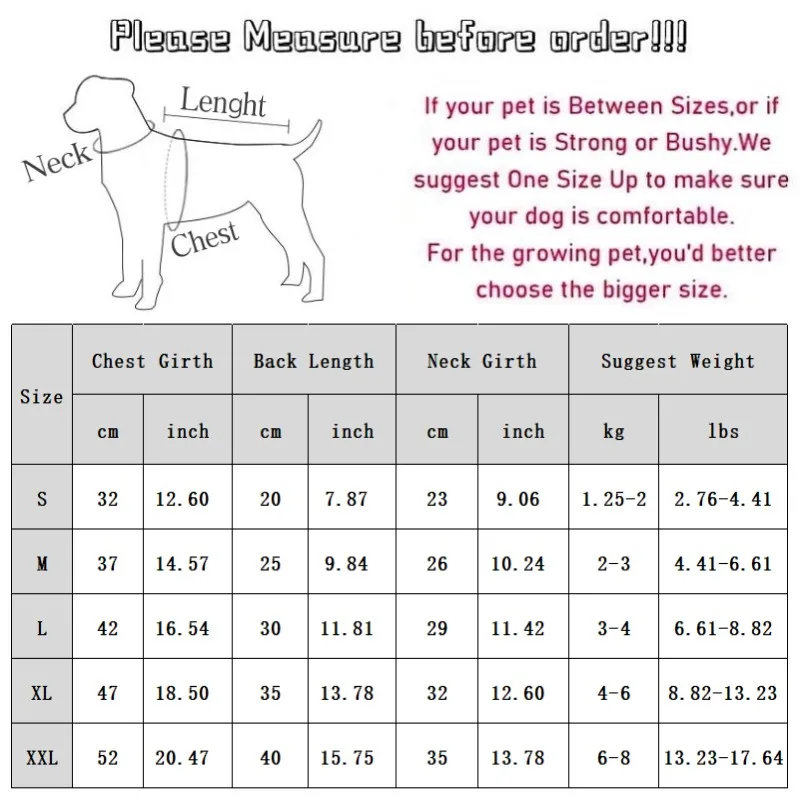 XXL: Pecho 52cm/20,47''; Longitud 40cm/15,75''; Cuello 35cm/13,78''; Peso sugerido 6-9 kg/13,23-17,64 libras.
