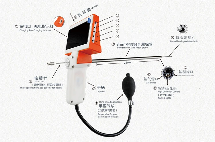 1. Caja de aleación de aluminio * 1;2. Pistola de infusión visual * 1;3. Aguja de inseminación 43cm * 1;4. Aguja de inseminación 38cm * 1;5. Cable de carga * 1 + cargador * 1;6. Manuales en chino e Inglés * 1;7. Tarjeta de Garantía * 1 + Certificado * 1.