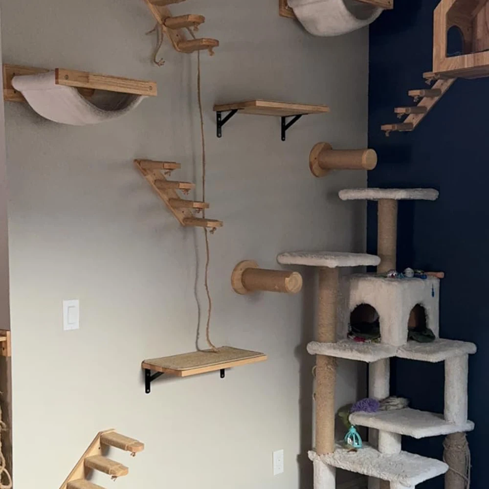 * Juguetes: el dueño puede colocar los juguetes favoritos del gato en la pared del gato y el gato trepará para jugar con el juguete.