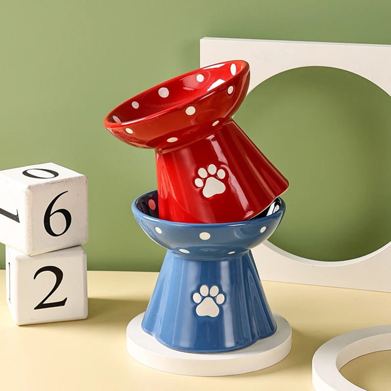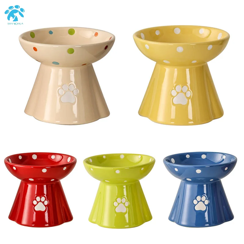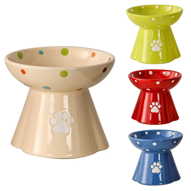 Plato de cerámica para mascotas, puntos coloridos, sin derrames, base alta, comida, alimentador de agua, contenedor con patrón de pata para perros y gatos