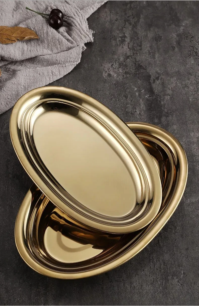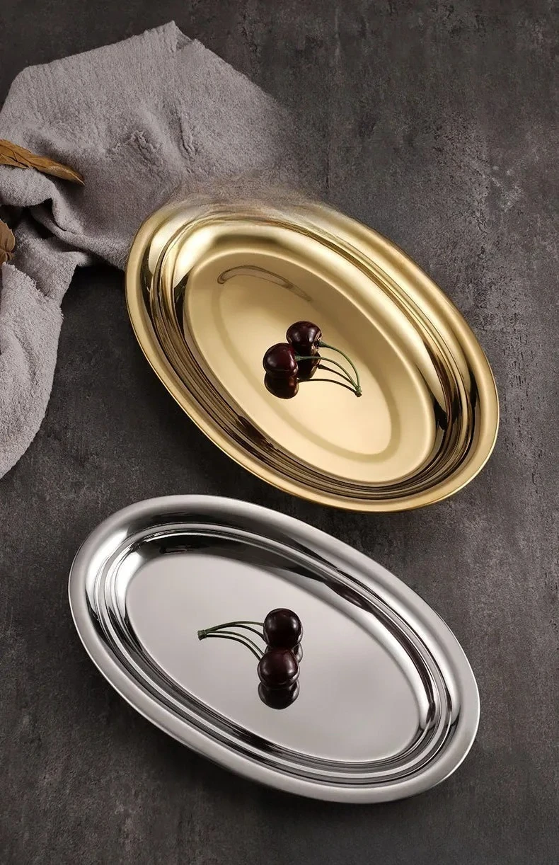 Plato ovalado de acero inoxidable, plato de pescado al vapor en forma de huevo, plato de oro coreano, plato de fideos de arroz para barbacoa