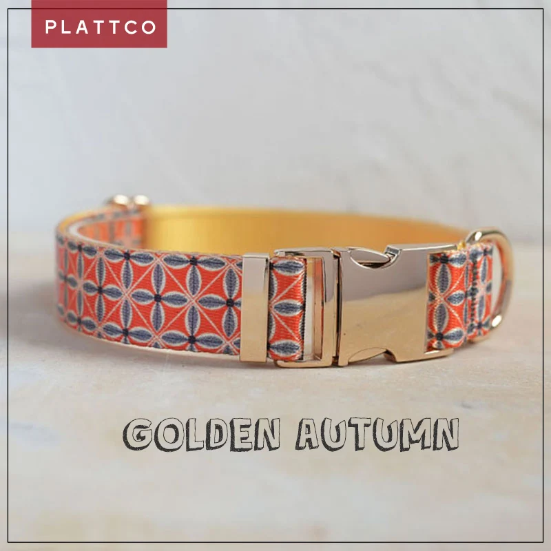 Collar de perro de diseño único PLATTCO estampado patrón de otoño dorado con hebilla de aleación de zinc de color claro de alta calidad 5 tamaños PDC304G