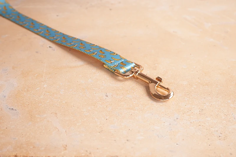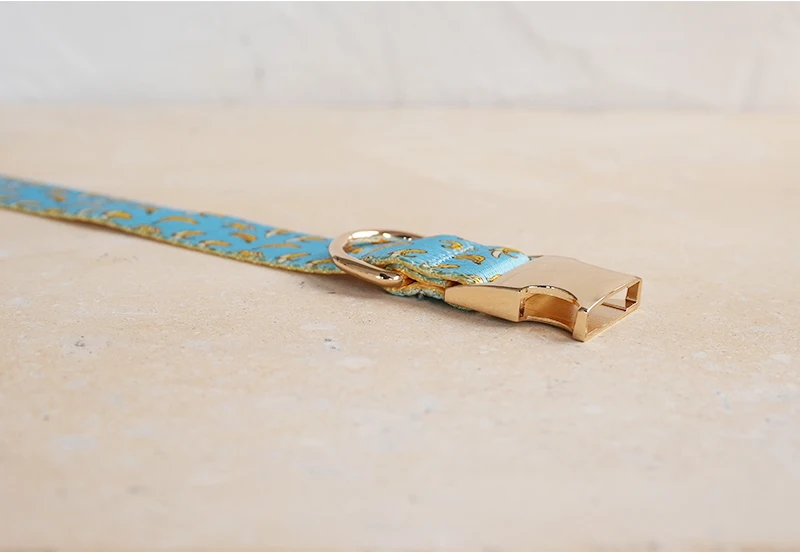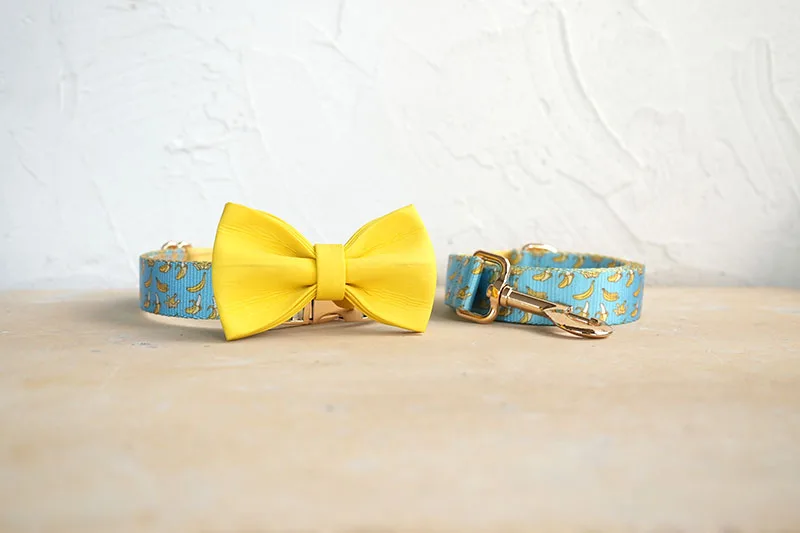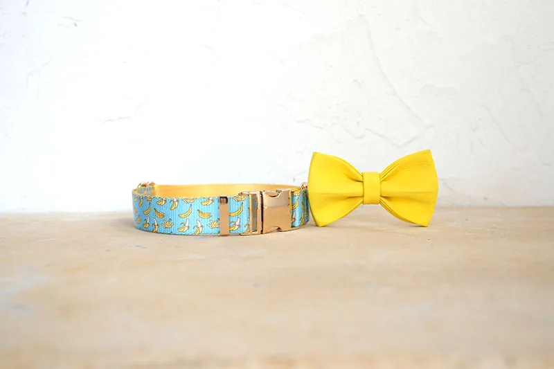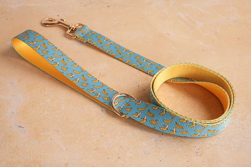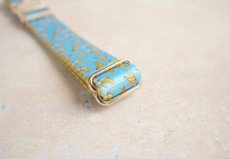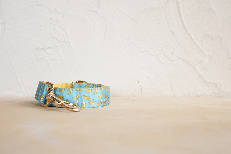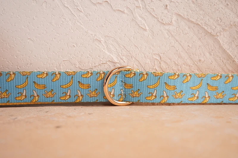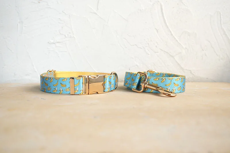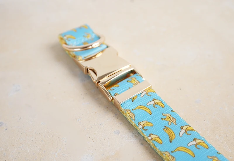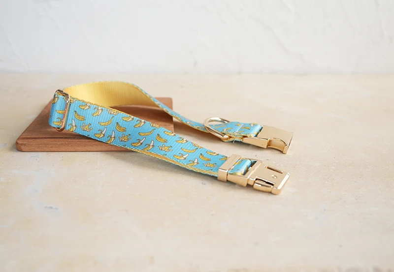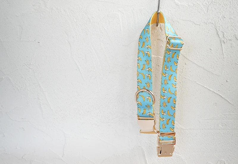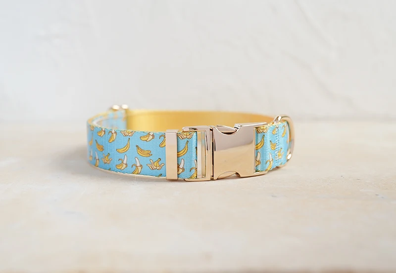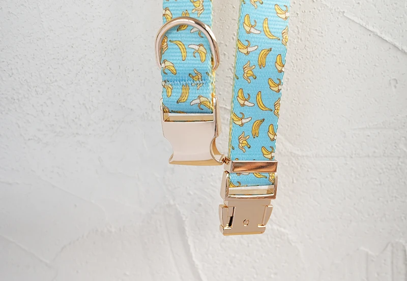 Patrón de BANCING BANANA con estampado de collar de perro único de PLATTCO emparejado con hebilla de plata de alta calidad 5 tamaños PDC327G