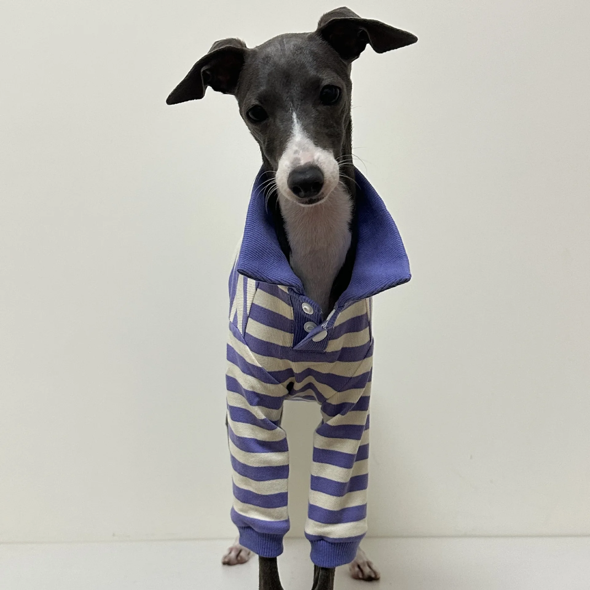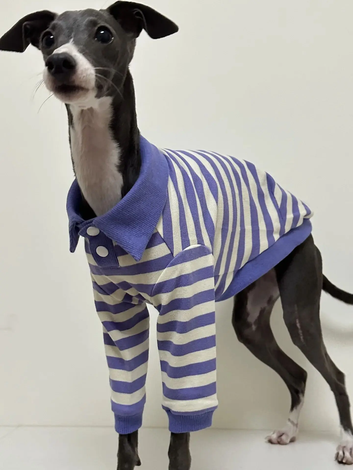 Realmente dudo que sea algodón, lo más probable es que sea 100% poliéster, ¡sin embargo, es realmente lindo! Las costuras son uniformes, ninguna sobresale. Cosido y confeccionado a la perfección. Para una niña pequeña tipo whippet (8.5 kg, pecho de 50 cm), pedí la talla L, pero quizás le hubiera quedado mejor la XL. Es genial que las mangas no sean largas, perfectas para cachorros.