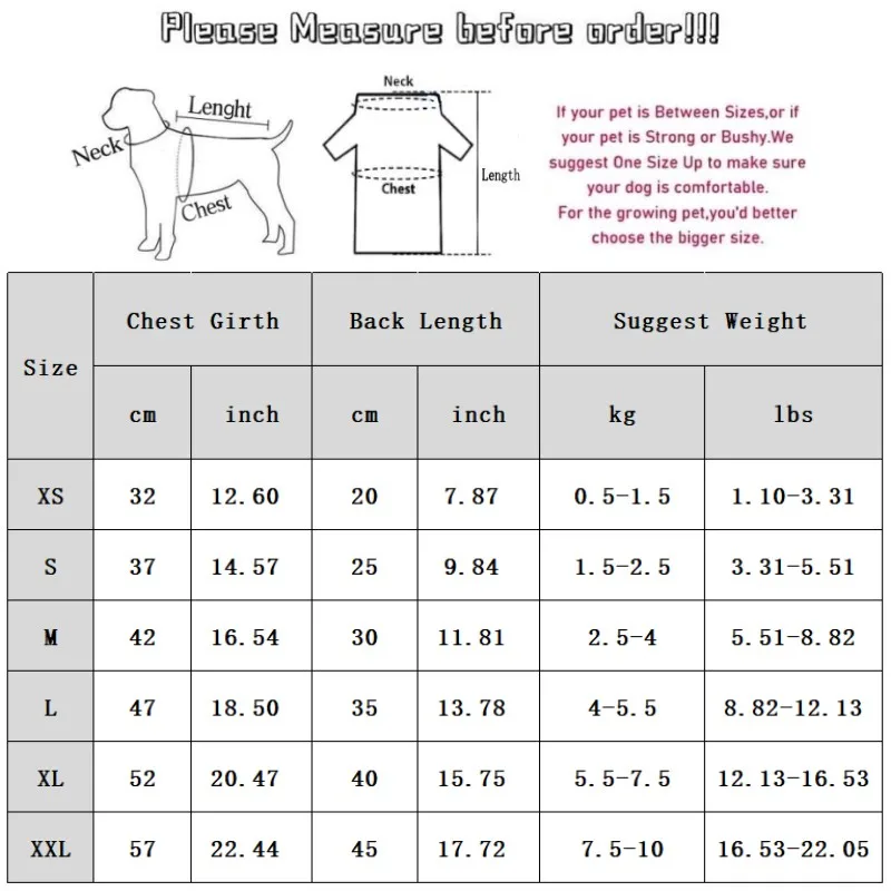 XXL: Pecho 57cm/22,44''; Longitud 45cm/17,72''; Peso sugerido 7,5-10 kg/16,5-22.05 lbs.