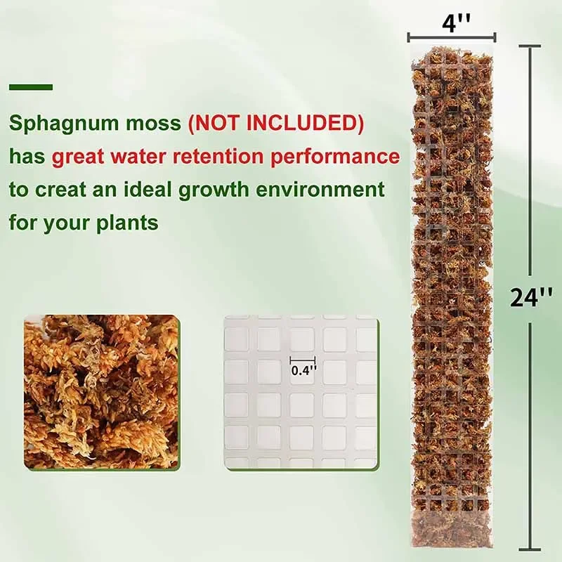 [Fácil de instalar y diseño sólido]: nuestras varillas de musgo de plástico son muy convenientes y se pueden instalar fácilmente.El poste de musgo de la planta tiene dos líneas de pliegue, que se doblan a lo largo de la línea de plegado para formar un musgo semicircular (en forma de D).¡No lo enrolle directamente en cilíndrico!Llénelo con musgo, insértelo en el suelo alrededor de los tallos de la planta, fije los tallos con una brida de jardín y luego inserte la estaca de madera del suelo.