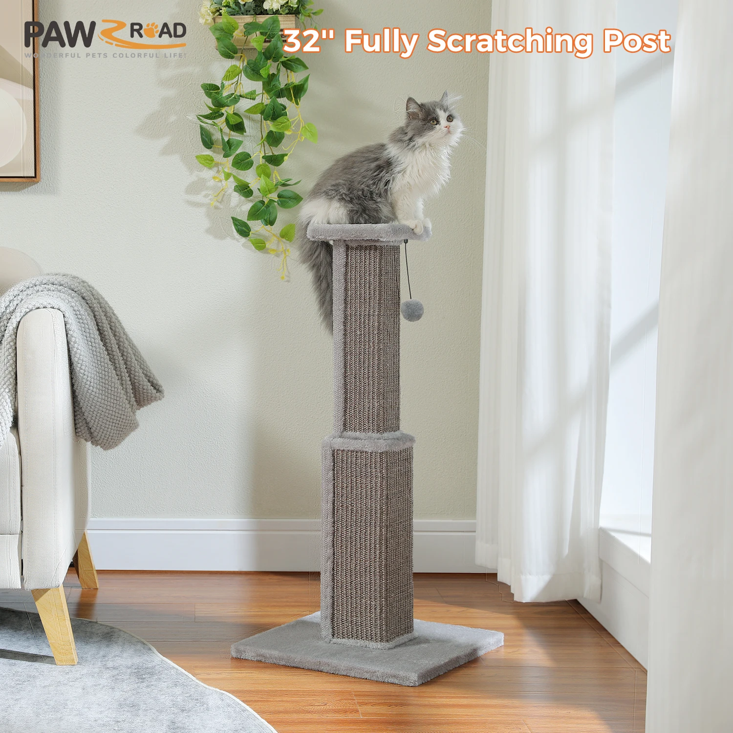 Grande y alto:Este elegante rascador para gatos mide 32 pulgadas de alto, anclado por una base estable de 15,7 x 15,7 pulgadas, lo que garantiza que permanezca en posición vertical incluso durante sesiones vigorosas de rascado.El pilar envuelto en sisal de 5 pulgadas de ancho ofrece una amplia área para que los gatos satisfagan sus necesidades de rascado.