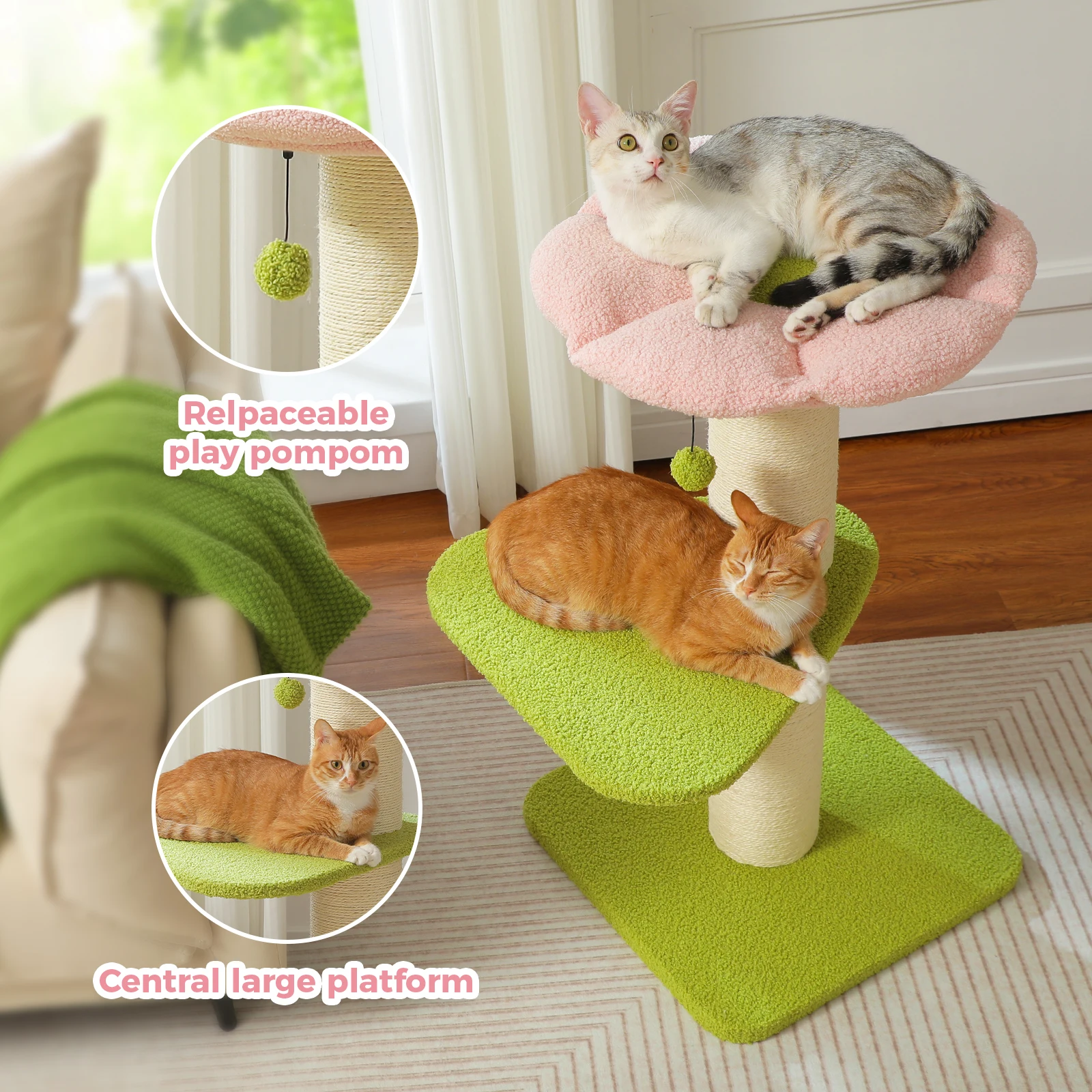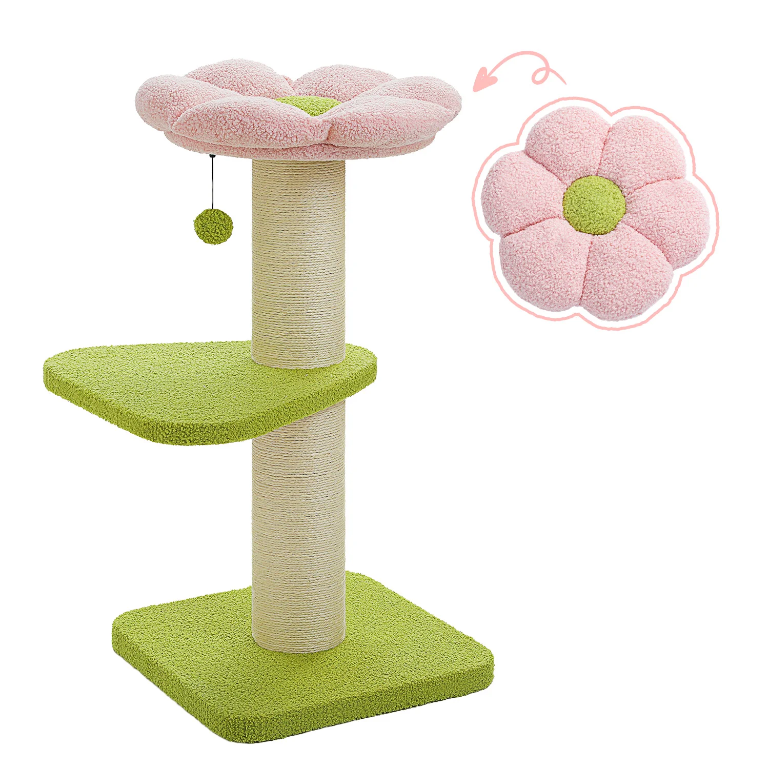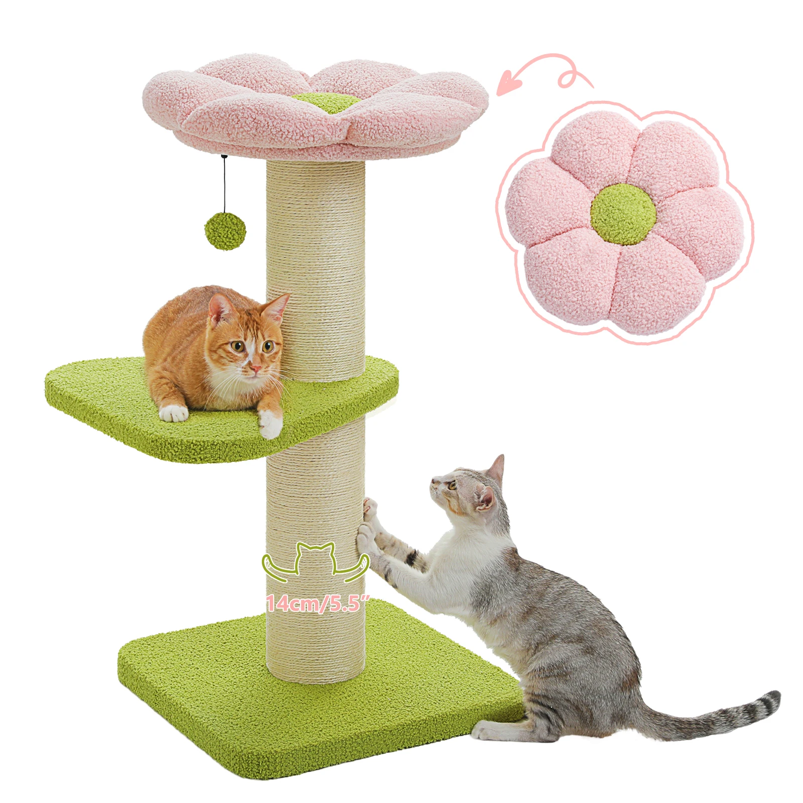 Juega y descansa para el paraíso:Equipado con 2 resistentes postes rascadores de sisal y un pompón de felpa, sus amigos peludos se divertirán en este árbol para gatos de flores en un tiempo ilimitado.