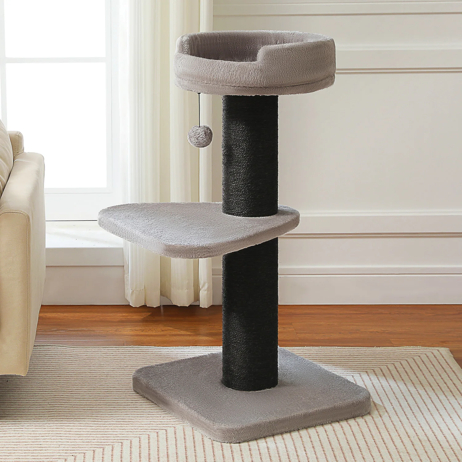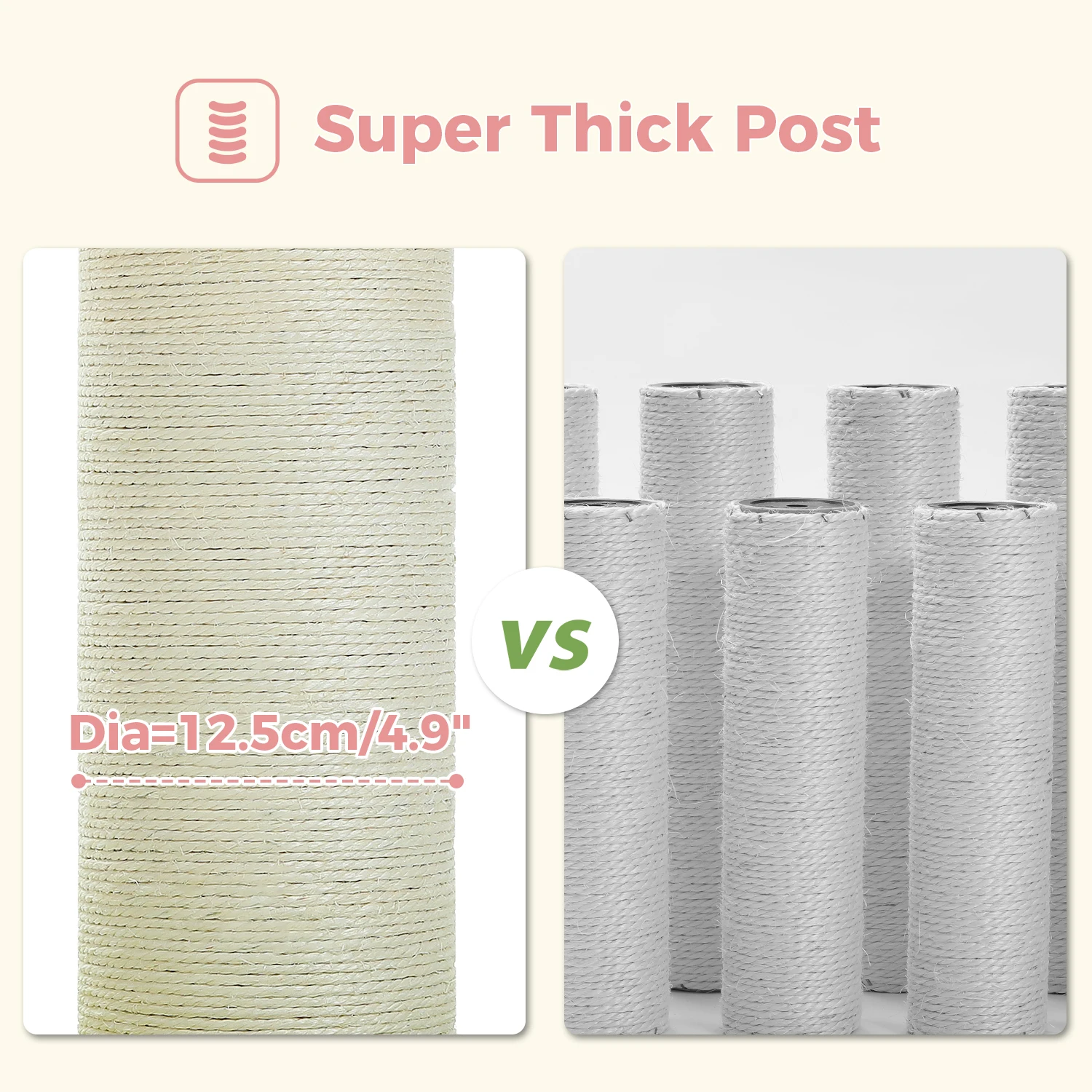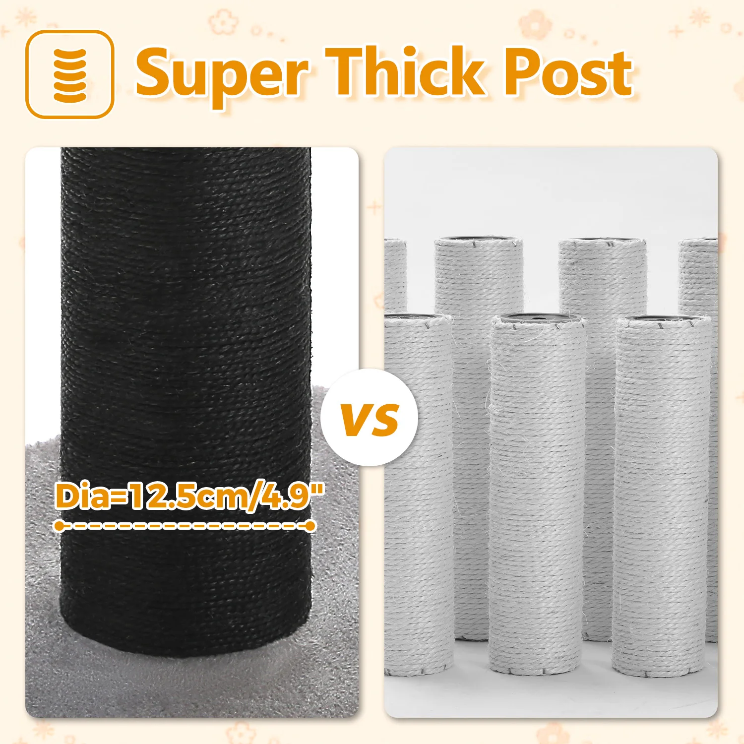 Poste súper grueso:El diámetro del poste cubierto de sisal natural alcanza 5,5'', lo que garantiza que sus gatos satisfagan sus necesidades diarias de rascado.Además, este rascador grueso para gatos garantiza la estabilidad de todo el árbol para gatos y mantiene a su bebé alejado de sus costosos muebles de manera eficiente.