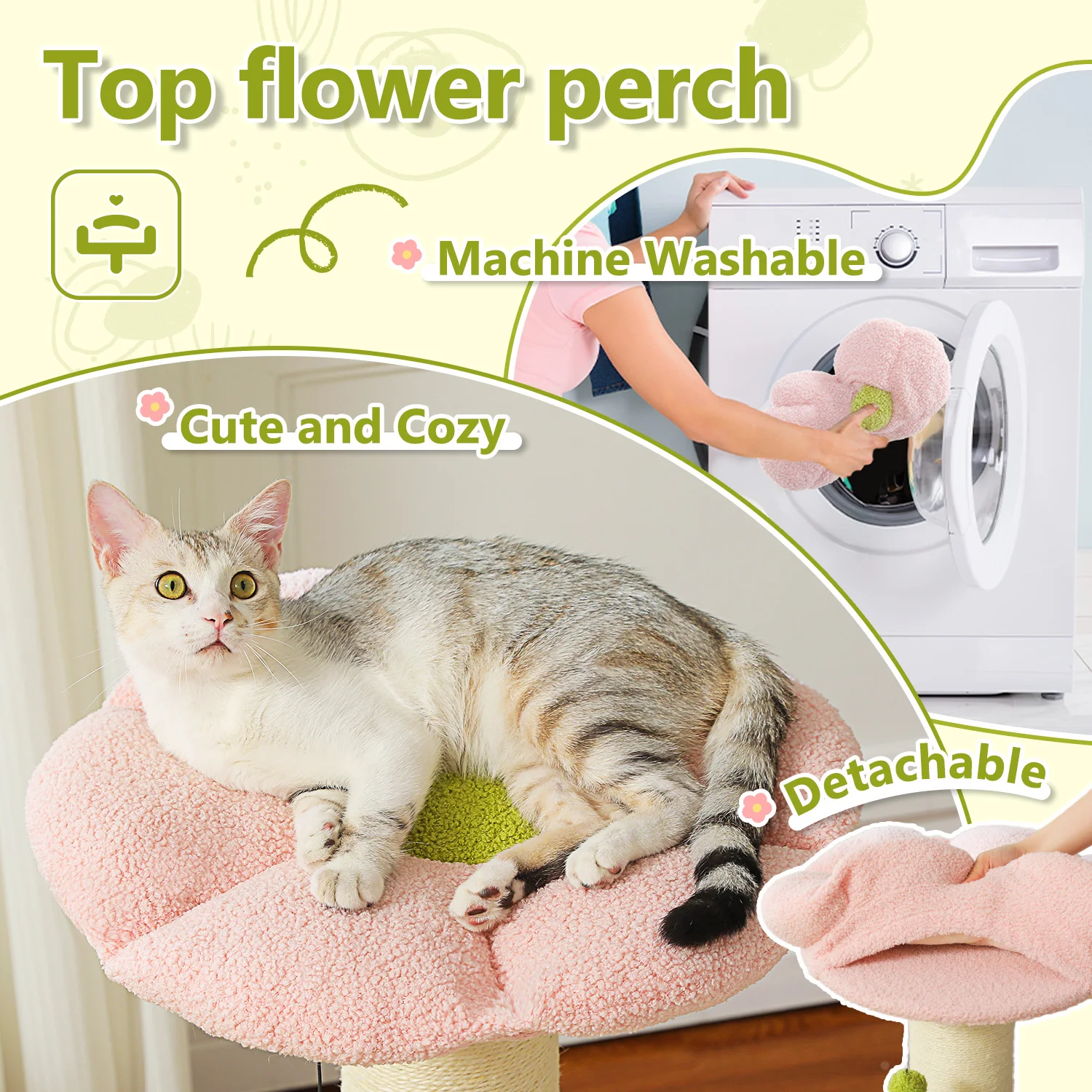 Diseño de flores único:El árbol para gatos rosa cuenta con una percha para gatos de flores de gran tamaño, lo que proporciona a su gato una cama esponjosa para descansar o tomar una siesta.Además, toda la cama superior para gatos es extraíble y lavable.Muy adecuado para que los gatos grandes se rayen.