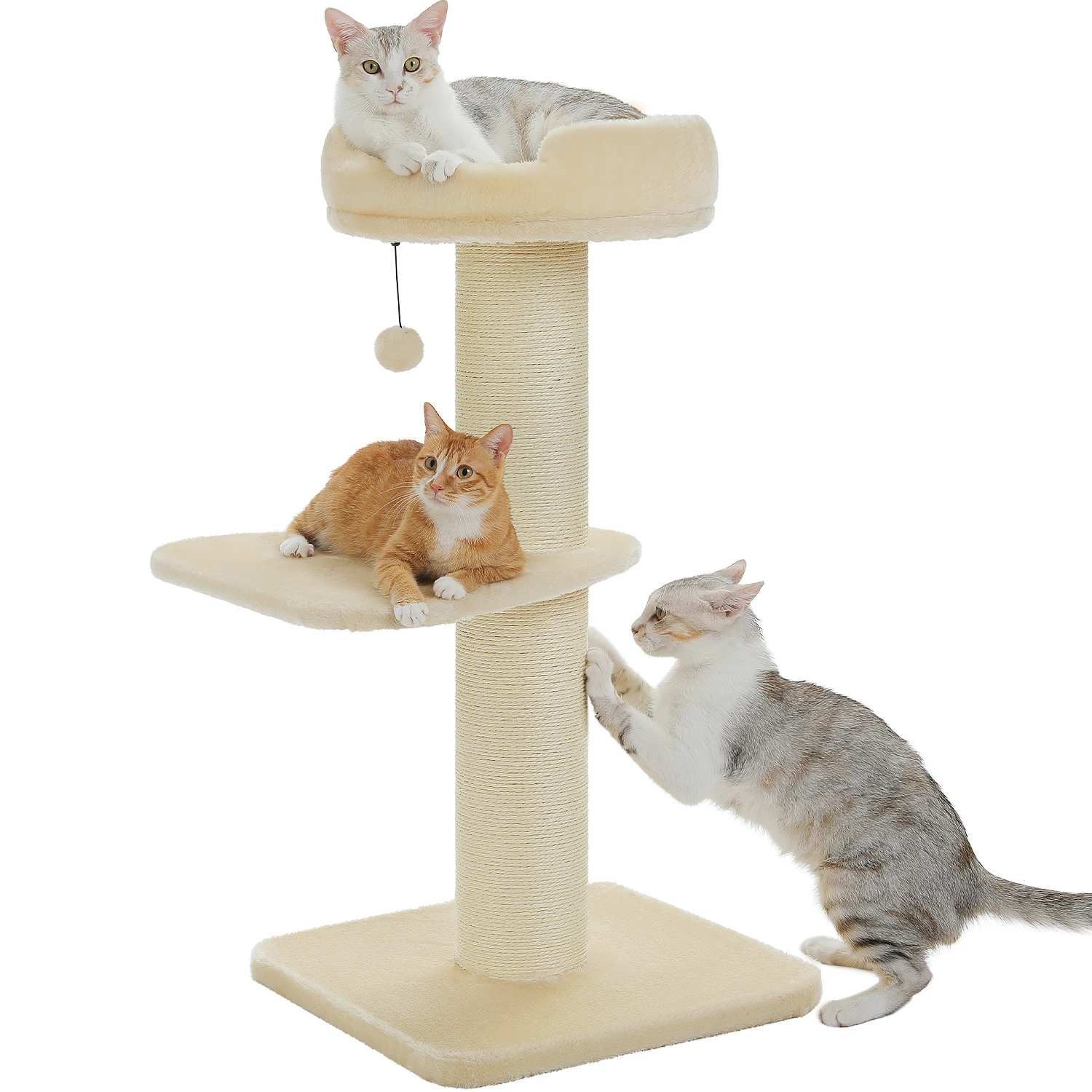Seguro y resistente:Con un pedestal grande ultragrueso, esta torre alta para gatos de interior puede sujetarse fácilmente cuando sus gatos se rascan o saltan hacia arriba y hacia abajo.Mientras tanto, la gran plataforma en el medio también permite que tu felino sube más suavemente.