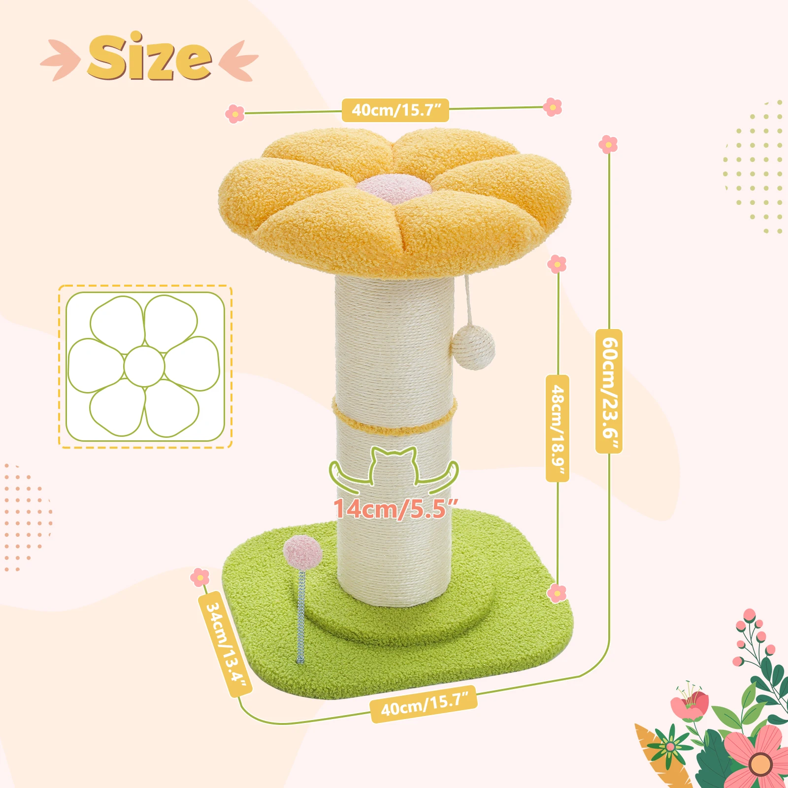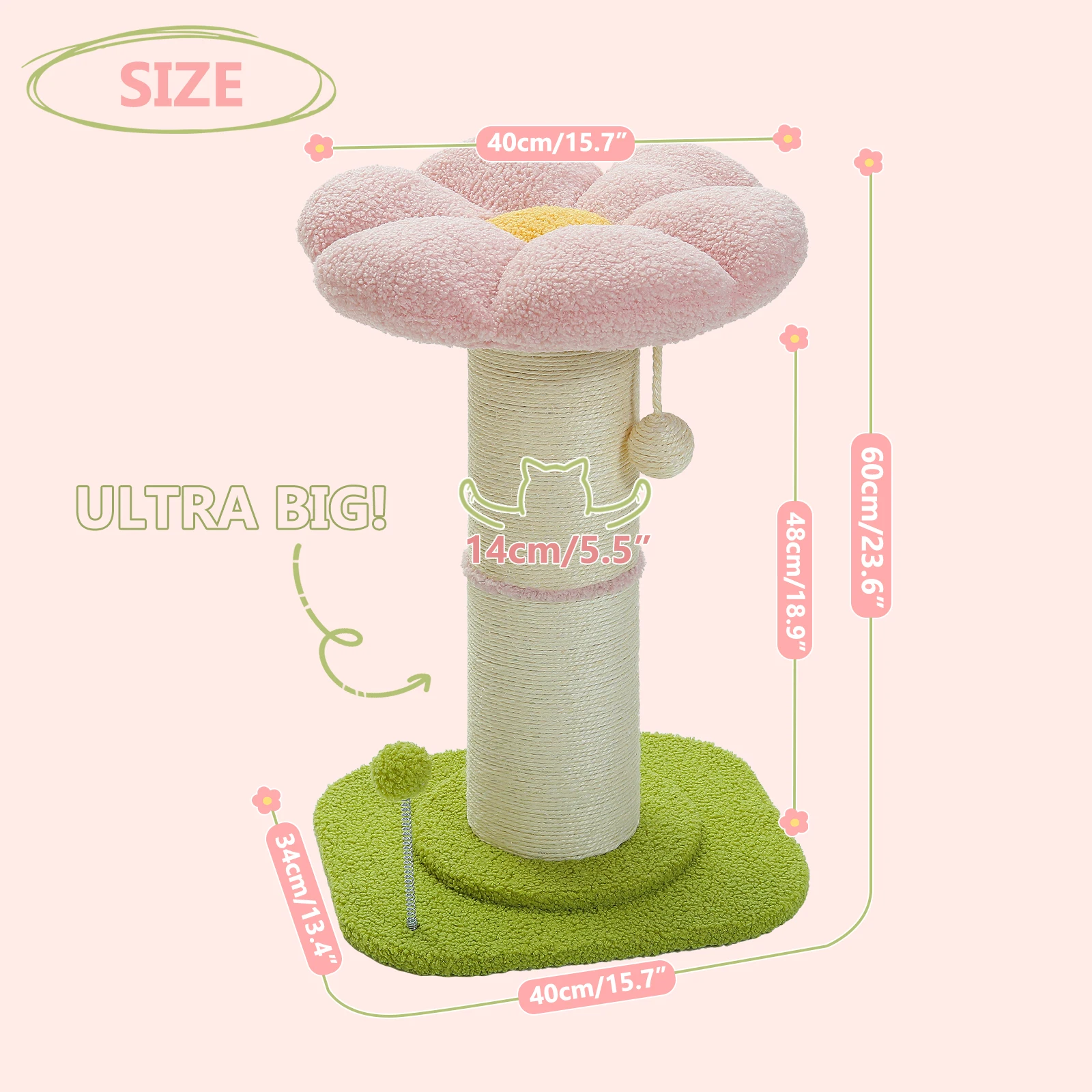 Poste rascador para gatos con forma de flor, árbol y gato, pequeño para interiores, con poste de Sisal Natural súper grueso, bolas de tapete para percha extraíbles estables de color rosa