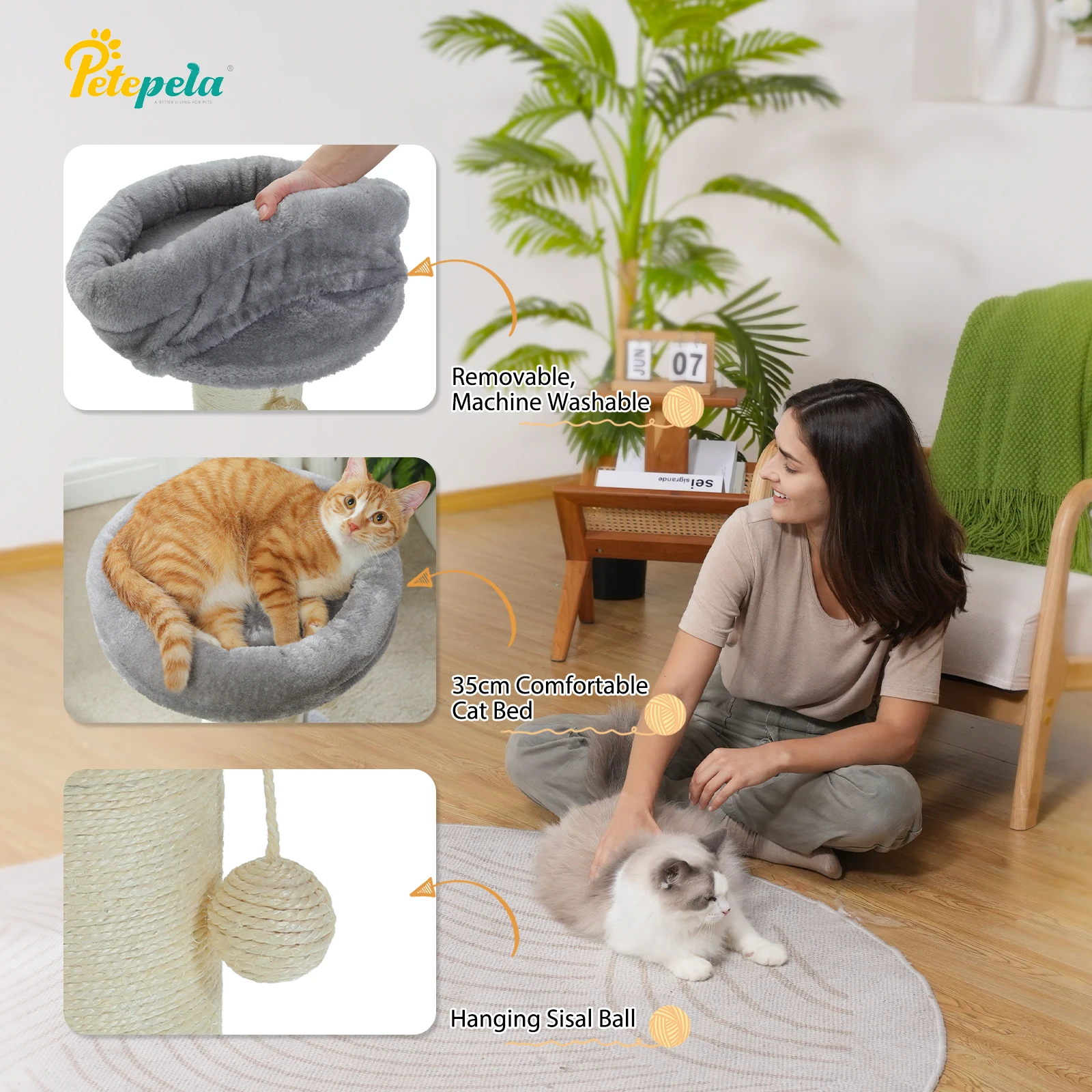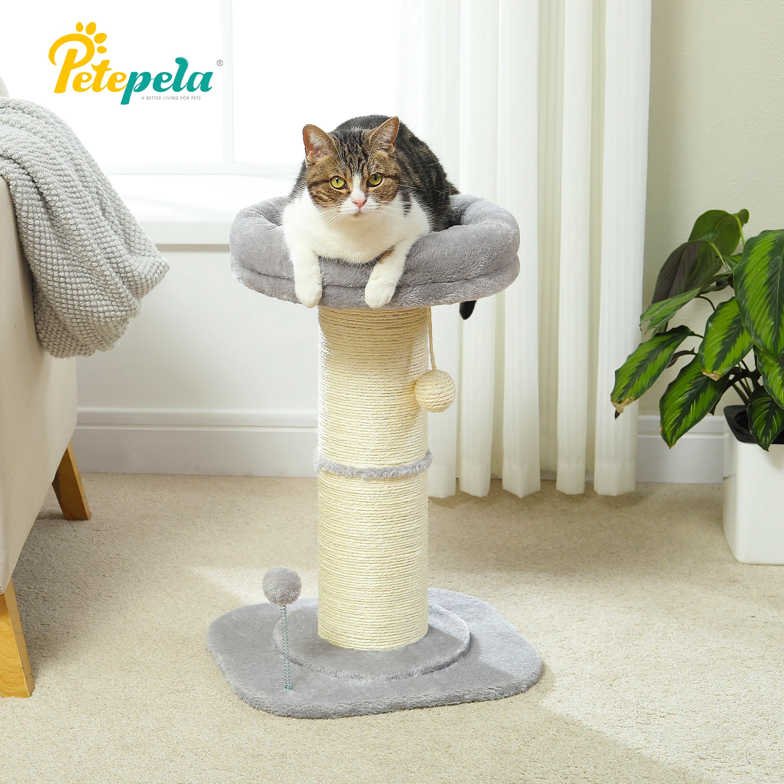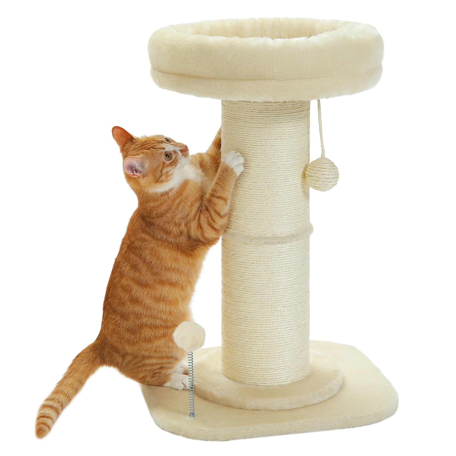 4.2 BOLAS PARA MÁS FELICIDAD: Este rascador para gatos viene con 1 bola de sisal colgante y 1 bola de resorte para que juegue su gato.Están en el rascador y en la placa base, puedes quitarlos como quieras.Este es un gran juguete interactivo para gatos cuando están solos.