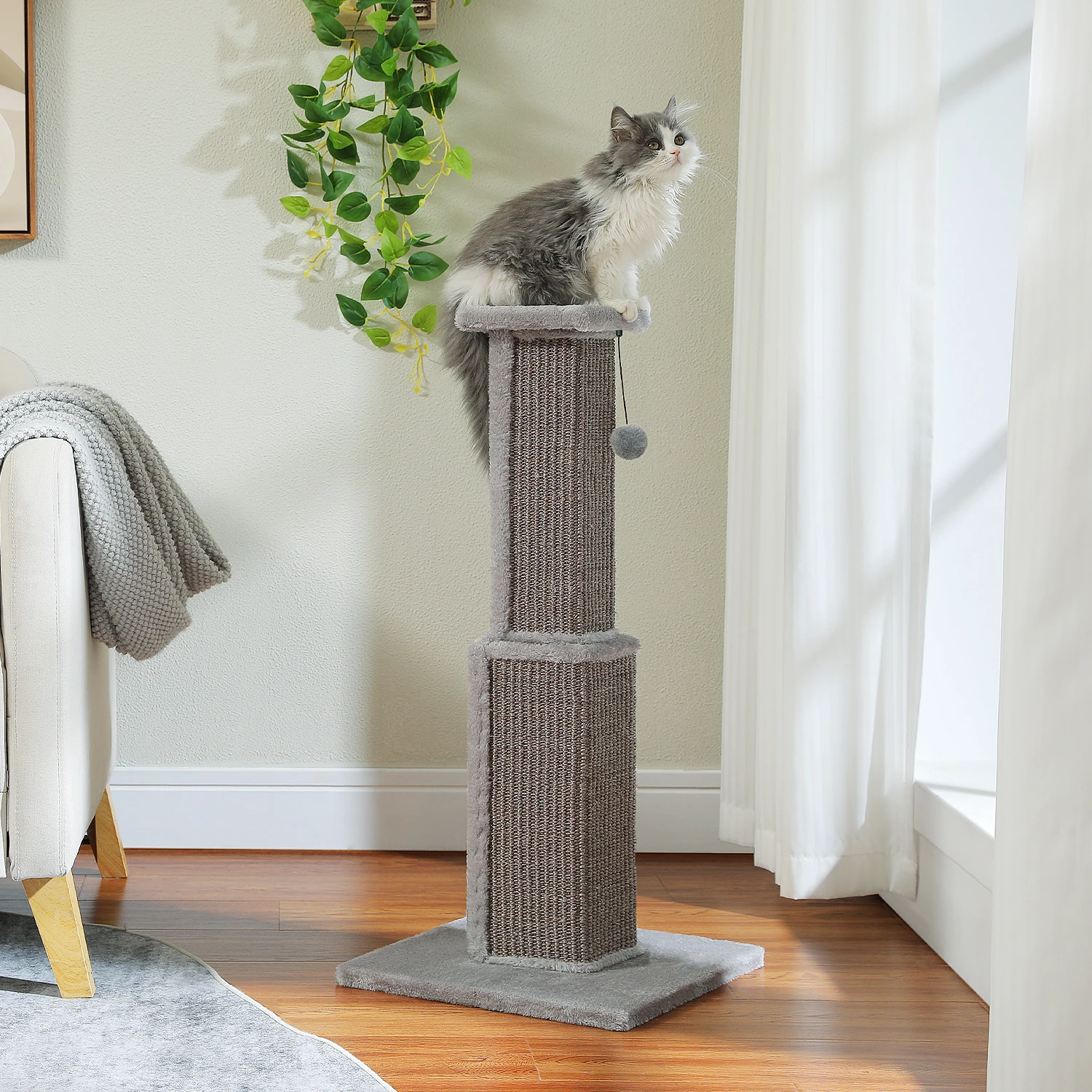 • Haste de sisal natural– robusto y eficaz: el vástago rascador está envuelto en sisal natural de alta calidad, seguro y no tóxico.Satisface la conducción natural de rascar de su gato y al mismo tiempo protege sus muebles contra daños.Gracias al diámetro extra grueso, el maletero es especialmente estable y ideal para el uso diario.